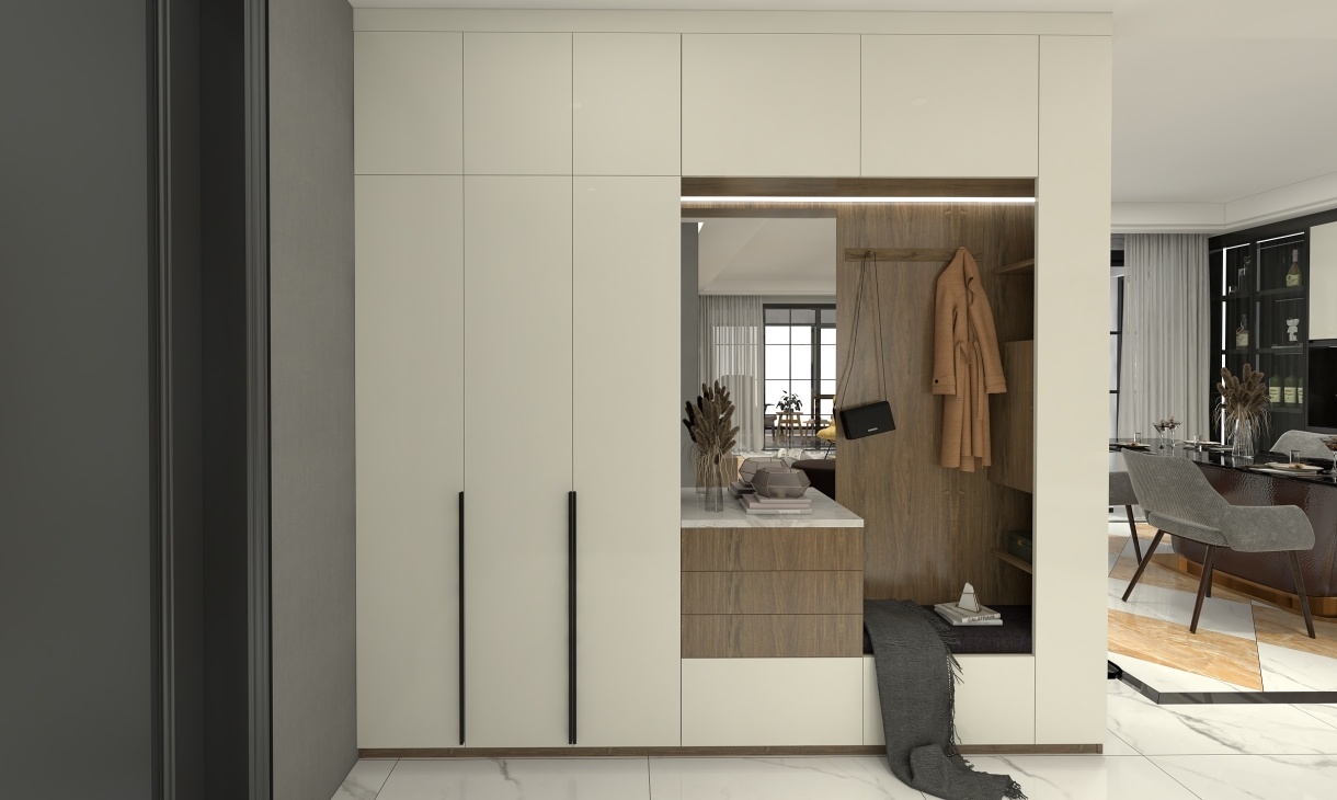 簡潔極具現代感的定制玄關柜,樸實無華的外表下,內部收納更開放區放設有全身鏡,掛衣架,換鞋凳,多功能收納抽屜。