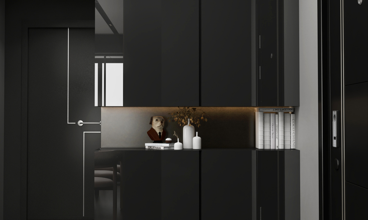 玄關的設計一柜到頂,以黑色為高柜的主,燈帶點綴裝飾空間,視覺上對比強烈,層次感十足,盡顯格調。
