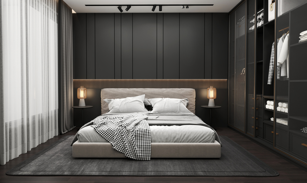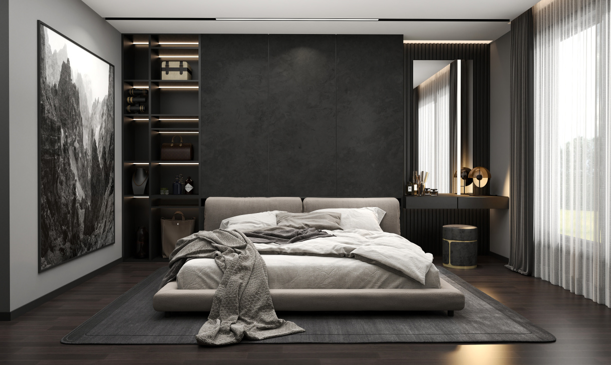 臥室床頭背景墻也以灰黑色為主,白灰色的床體軟裝對比鮮明,彰顯個性前衛,精致梳妝臺富有設計感。