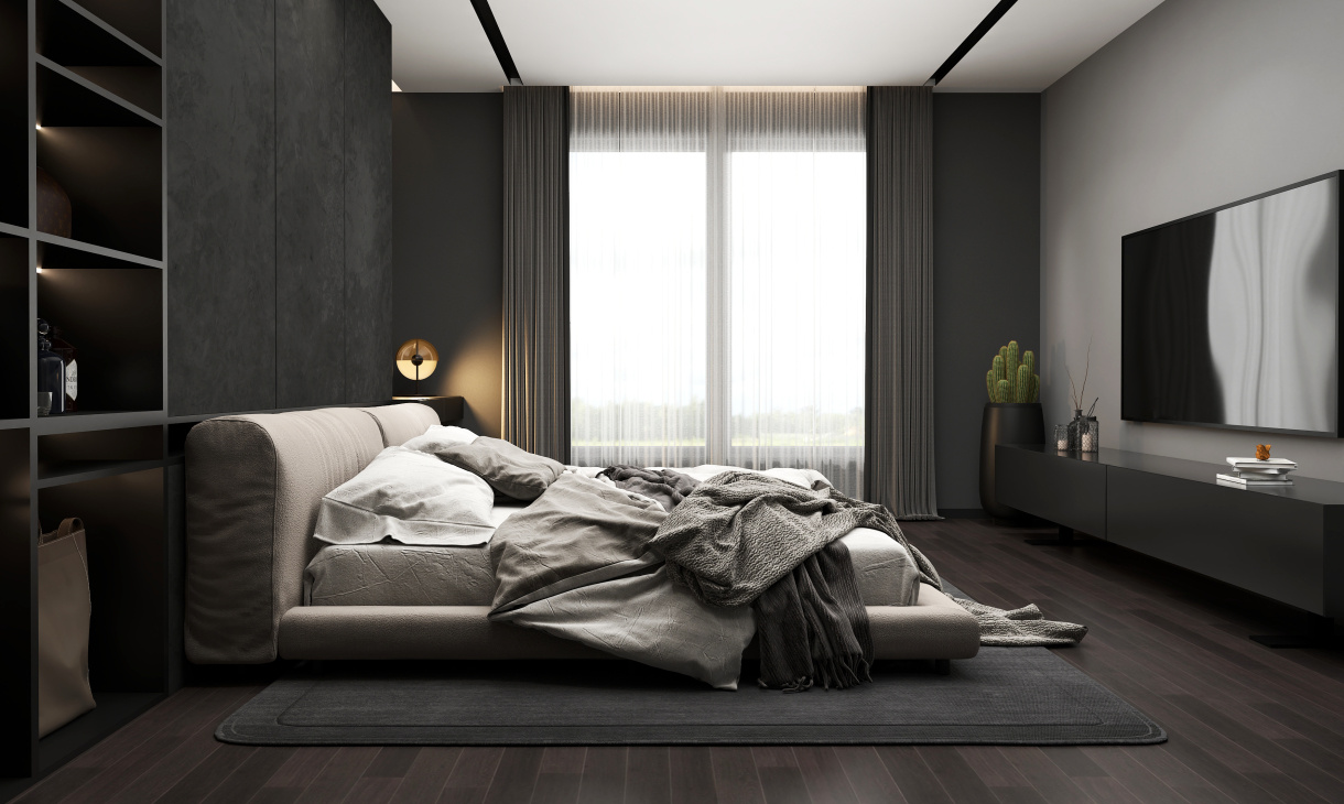 兩層窗簾的設計讓臥室顯得更大氣,黑色電視柜簡潔美觀。