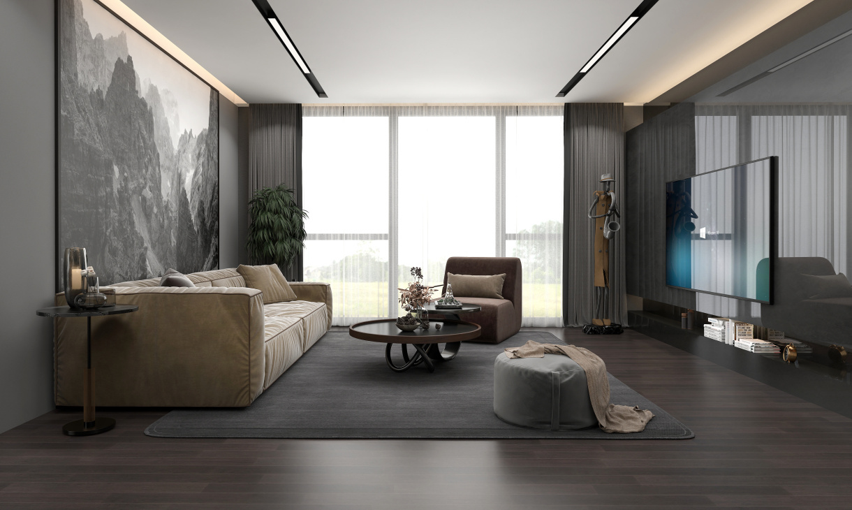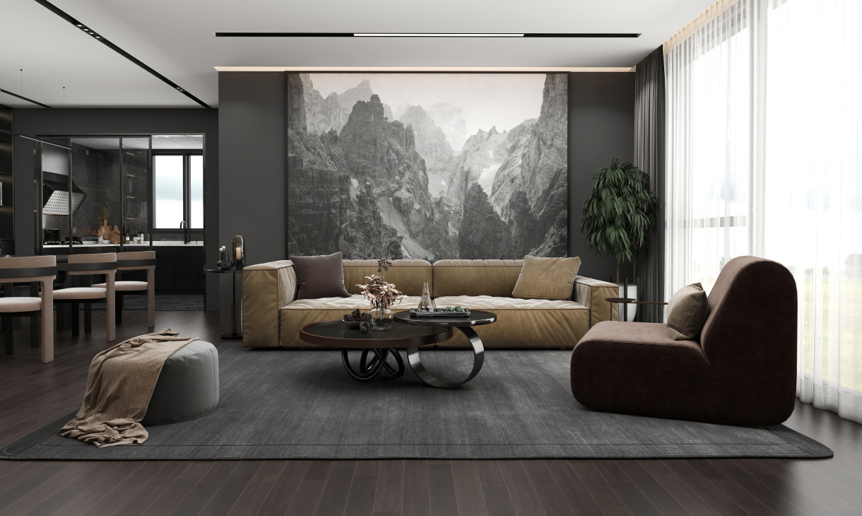 沙發背景墻采用山水畫作為裝飾,與白色的天花、白灰色窗簾相呼應,營造出黑色獨特的客廳空間。