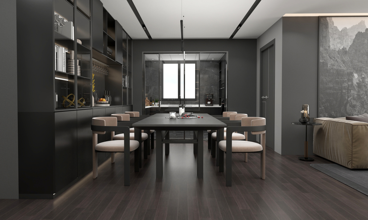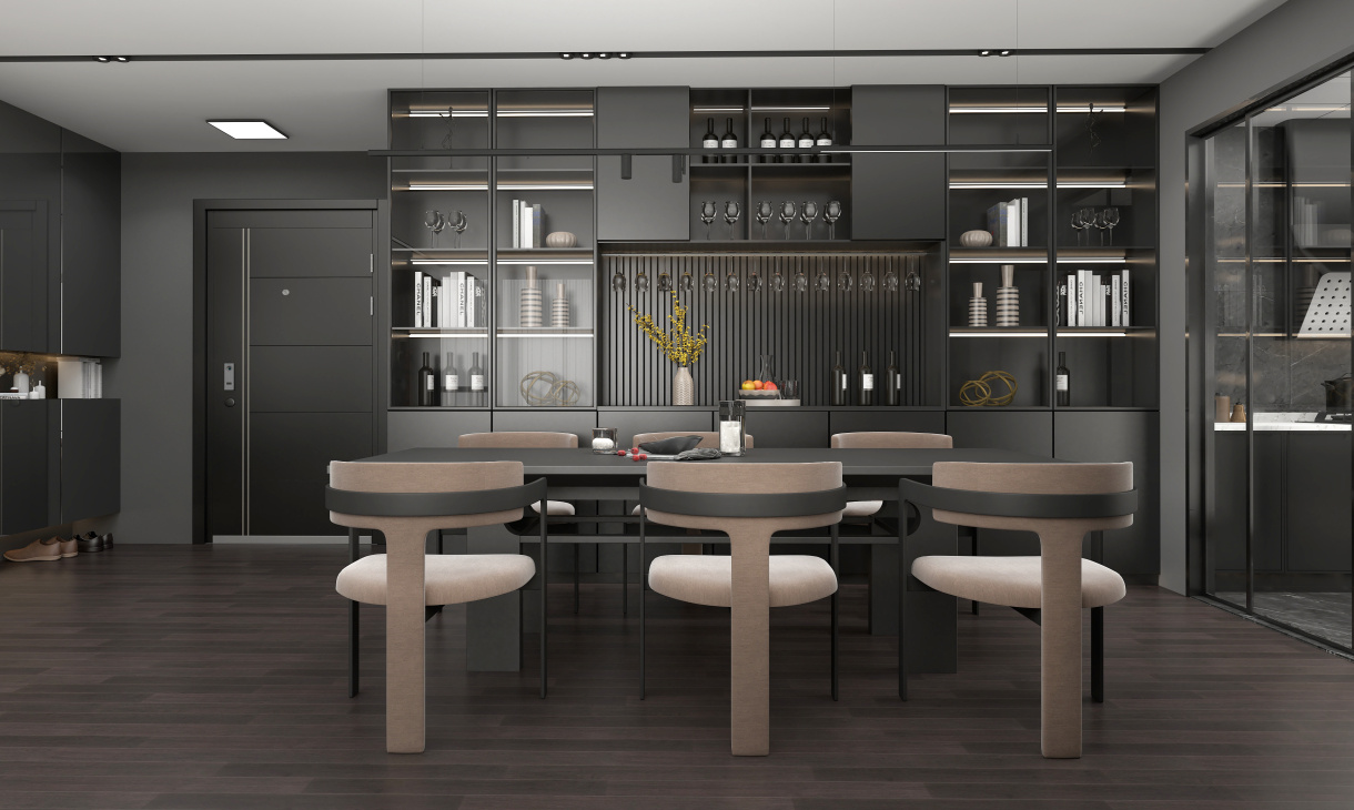 餐邊柜采用玻璃柜門,整體空間以黑色調為主,玻璃柜門和燈光的渲染之下通透又美觀。