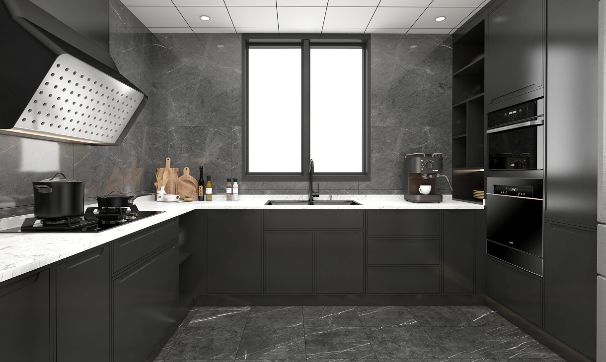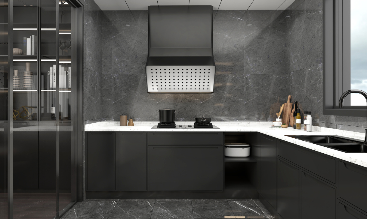 廚房色調依舊沿用黑調,地柜采用隱形拉手更加整潔有品位,白色的臺面和原木色餐具點綴空間。