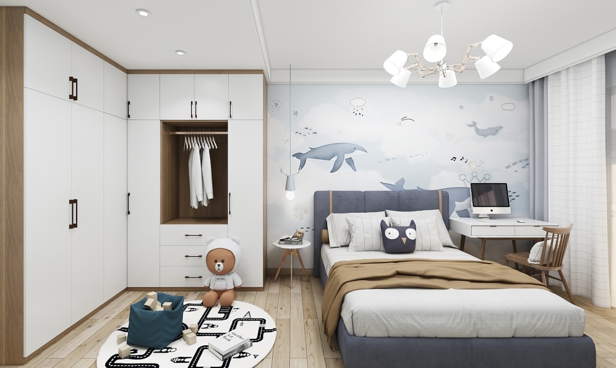 孩子的成長是需要陪伴的,轉(zhuǎn)角處設(shè)計(jì)到頂衣柜,巧妙利用空間,中間設(shè)計(jì)互動(dòng)休閑區(qū),給孩子留下足夠的空間,