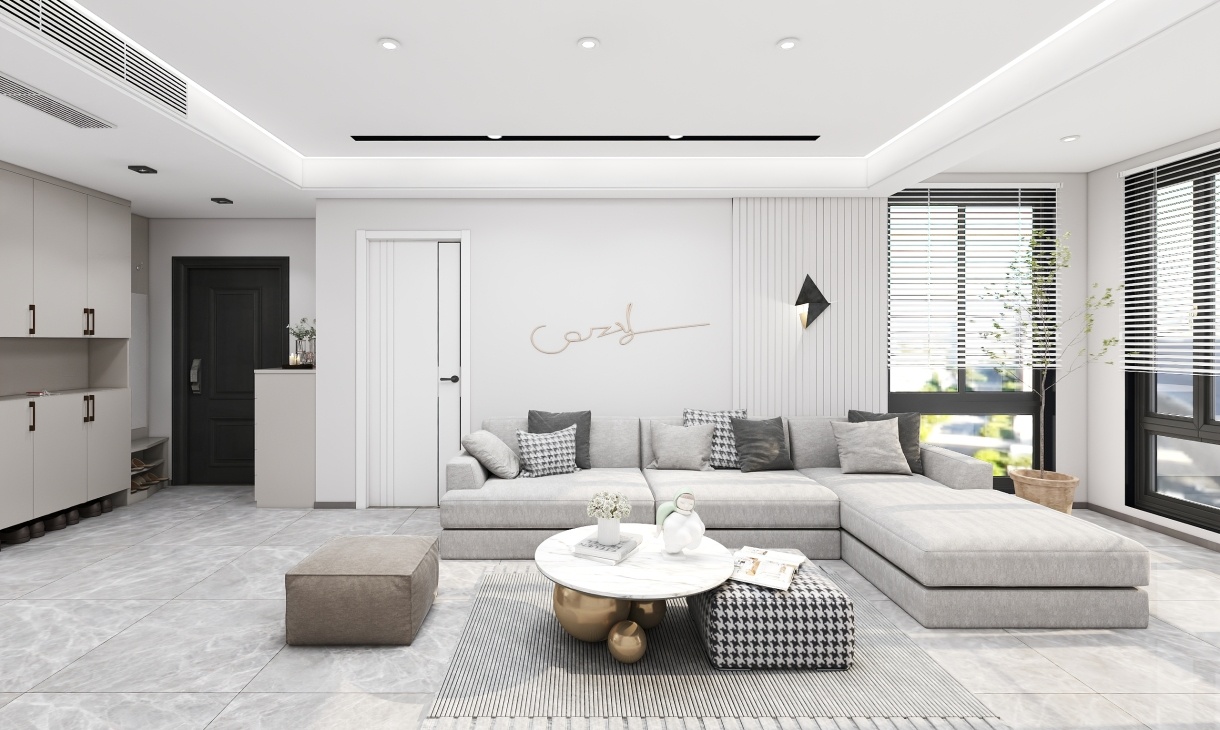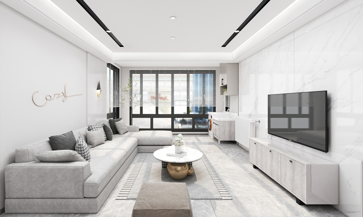客廳是家的中心,娛樂、休閑停留最長時間的空間,整體的白色整潔舒適,淺灰色的沙發提升格調。