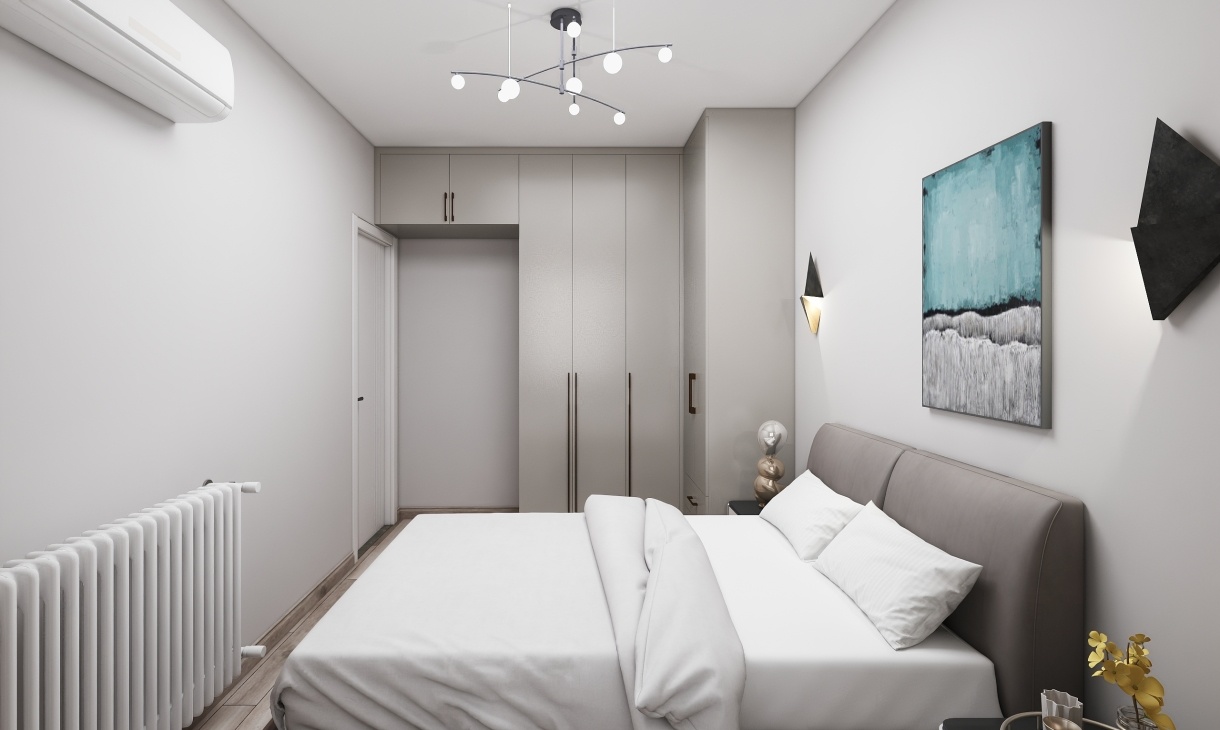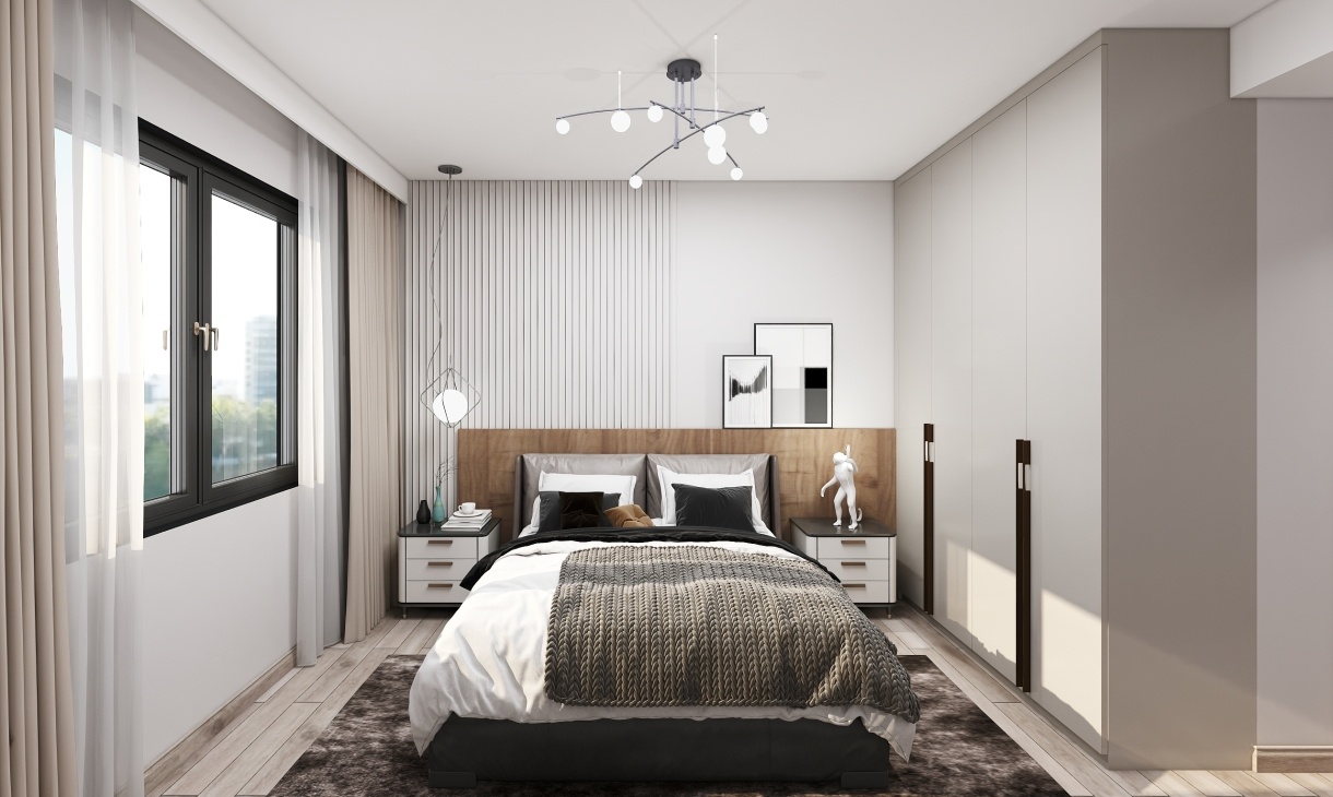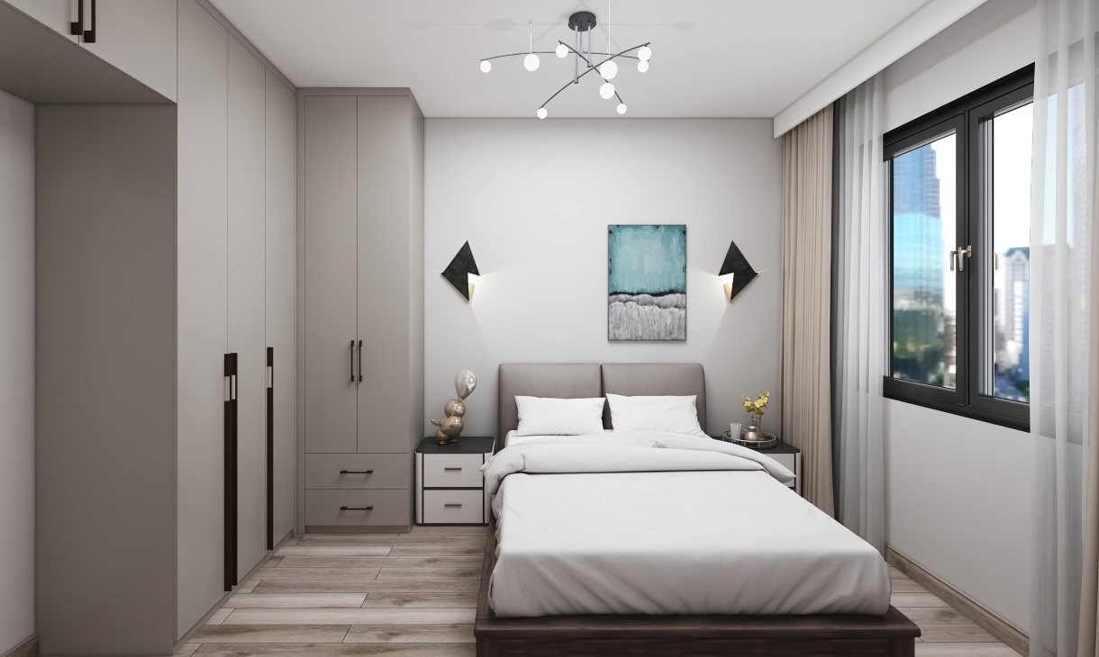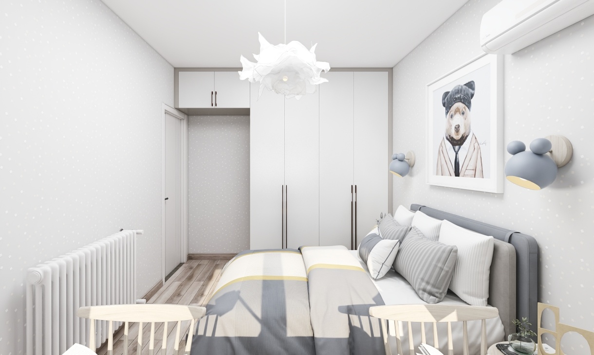 在顏色搭配上以舒適為主,到頂衣柜的設計收納力更強,簡單不失品位的裝飾品,輕松營造出現代感十足的次臥空間。
