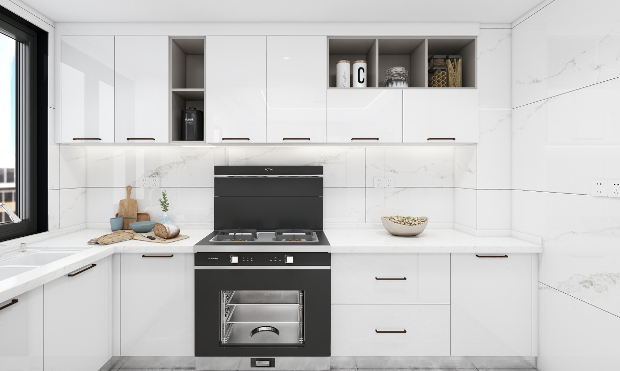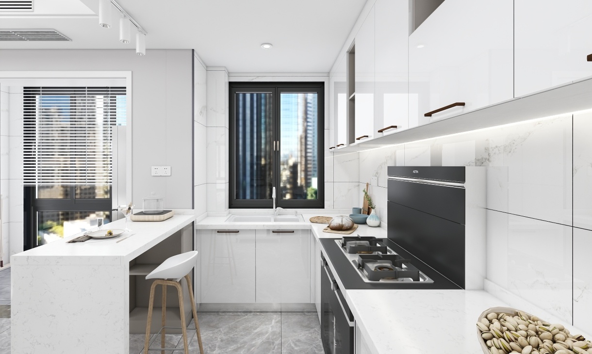 白色的整體櫥柜更顯整潔,布局合理空間光線充足,淺色的石英石臺面更加現代化。