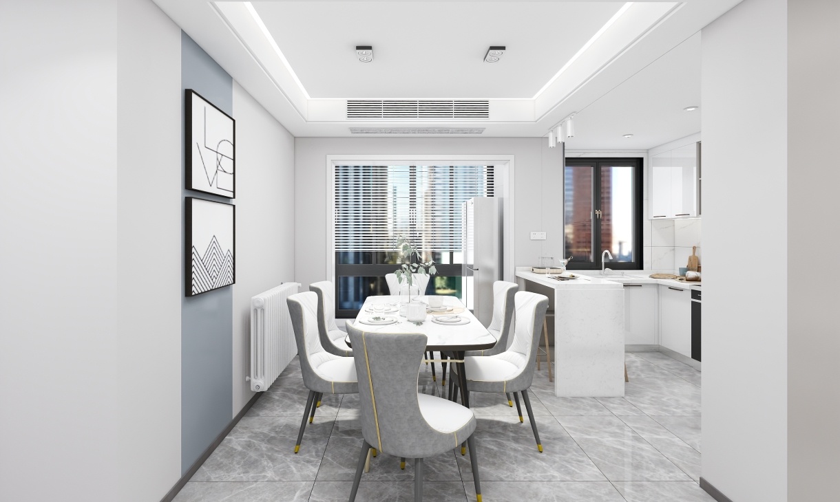 餐廳的設計與客廳相呼應,白色餐桌搭配淺灰色餐椅品位不俗,簡潔的裝飾畫將現代風格的簡潔完美展現。