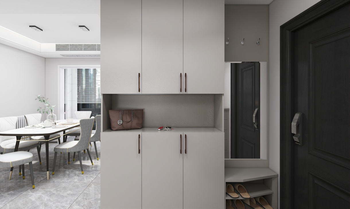 白色簡潔的入戶柜,分區明確,設計換鞋位,底部收納使用更方便,一進門就能卸下高跟鞋、包包,體驗家的舒適。