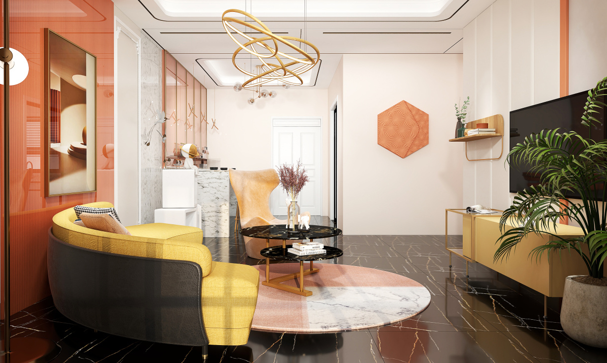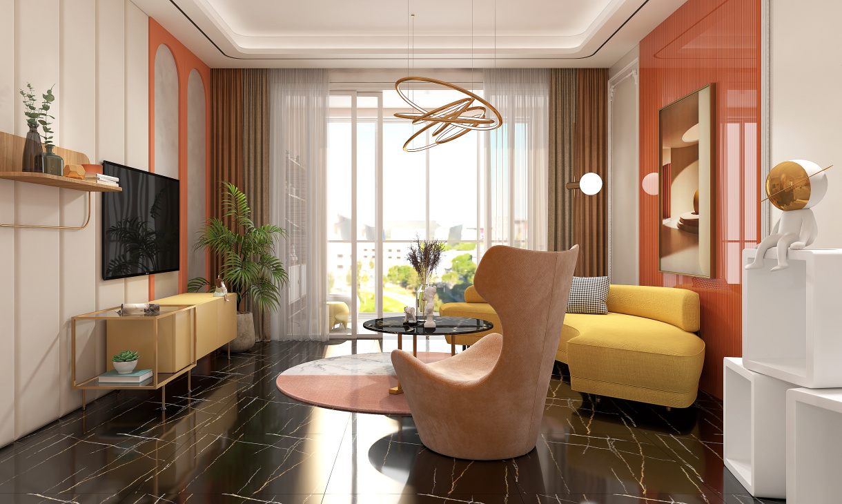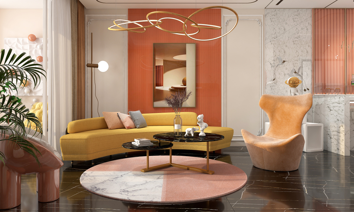 客廳設(shè)計主要以時尚橘色和黃色為主,圓弧形的沙發(fā)設(shè)計可躺可坐舒適加倍,毛毯和單椅顏色一致豐富空間。