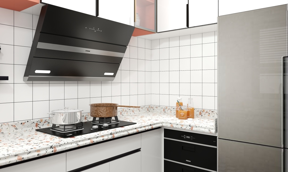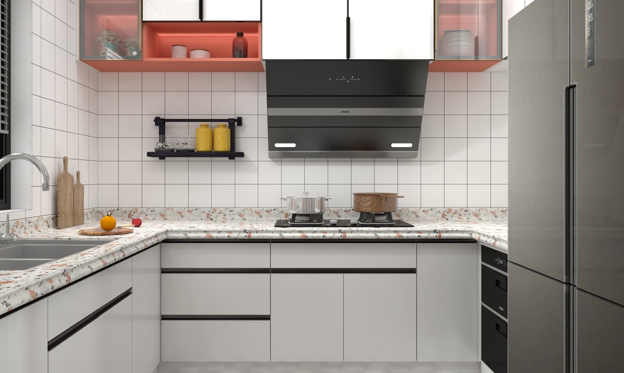 廚房空間整體以白色櫥柜為主,時尚橙色點綴空間,簡潔的線條刻畫出廚房的輪廓,碎花石英石臺面點綴空間。