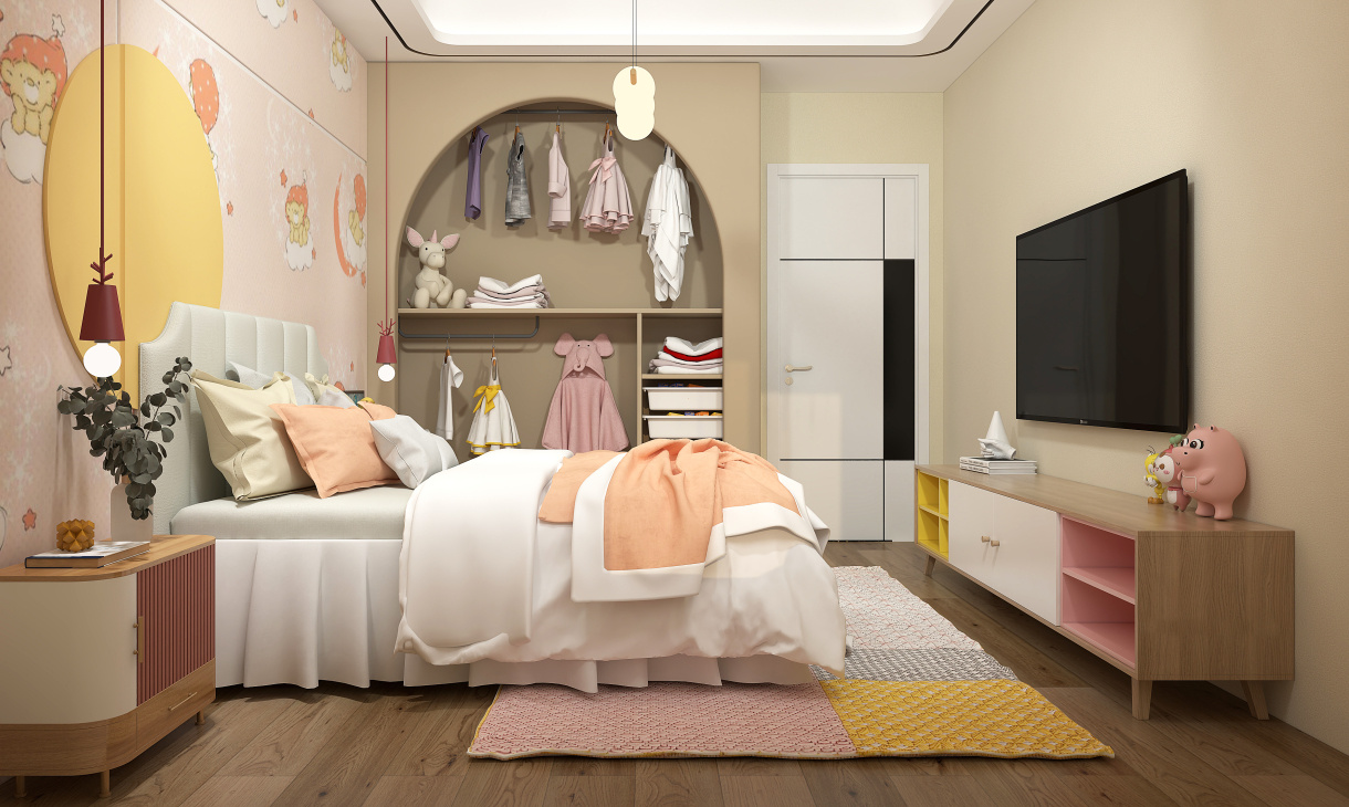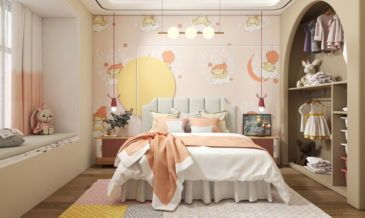 每個孩子都有一個公主夢,衣柜的設(shè)計美感十足,充滿童趣的墻紙讓整個空間格外可愛與舒適。