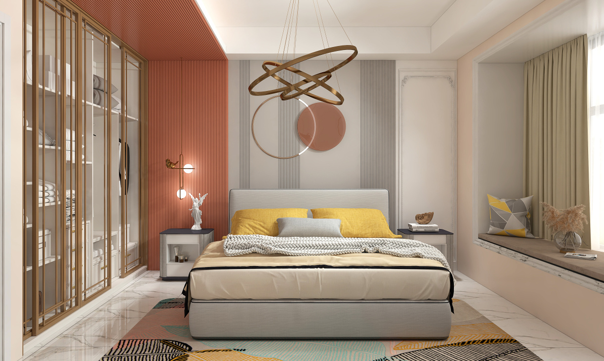 背景墻的圓形墻飾與時尚吊燈更具有整體性,飄窗設(shè)計成休閑區(qū),簡潔不失大氣。
