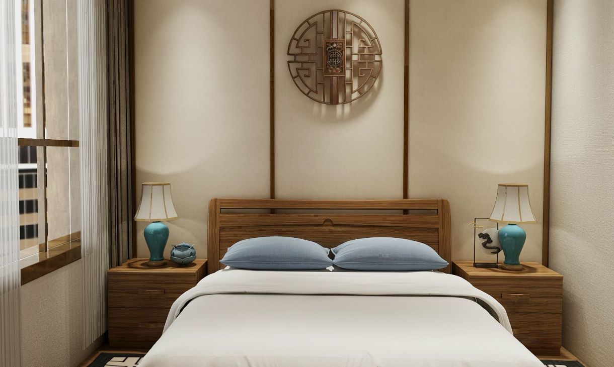 中式講究的就是對稱,所以床頭柜放了兩只臺燈,中間墻面對稱設計兩者呼應。