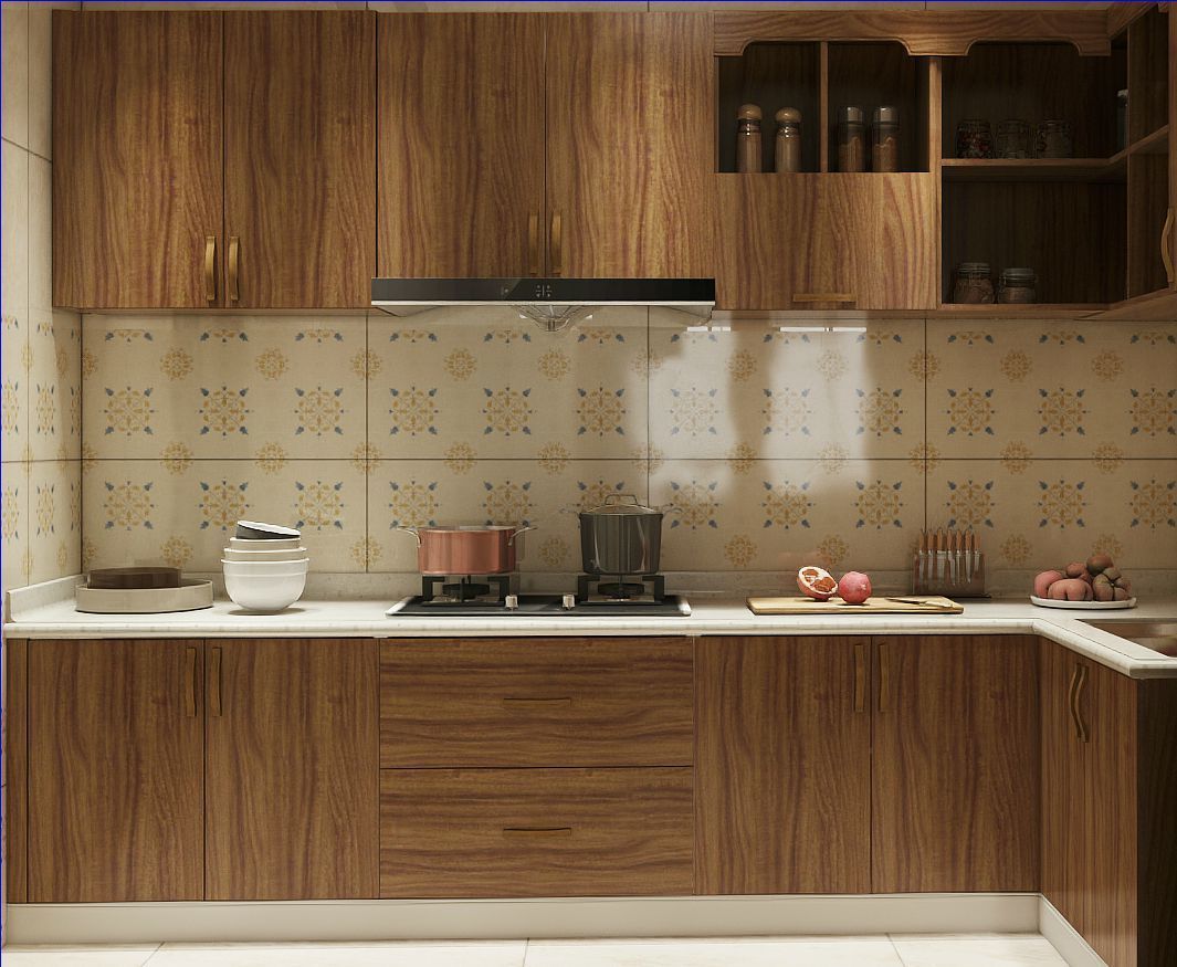 花紋瓷磚搭配金木色系整體櫥柜,古樸有韻味,復古又個性,嵌入抽煙機讓廚房整體統一規整,便于清潔打掃。