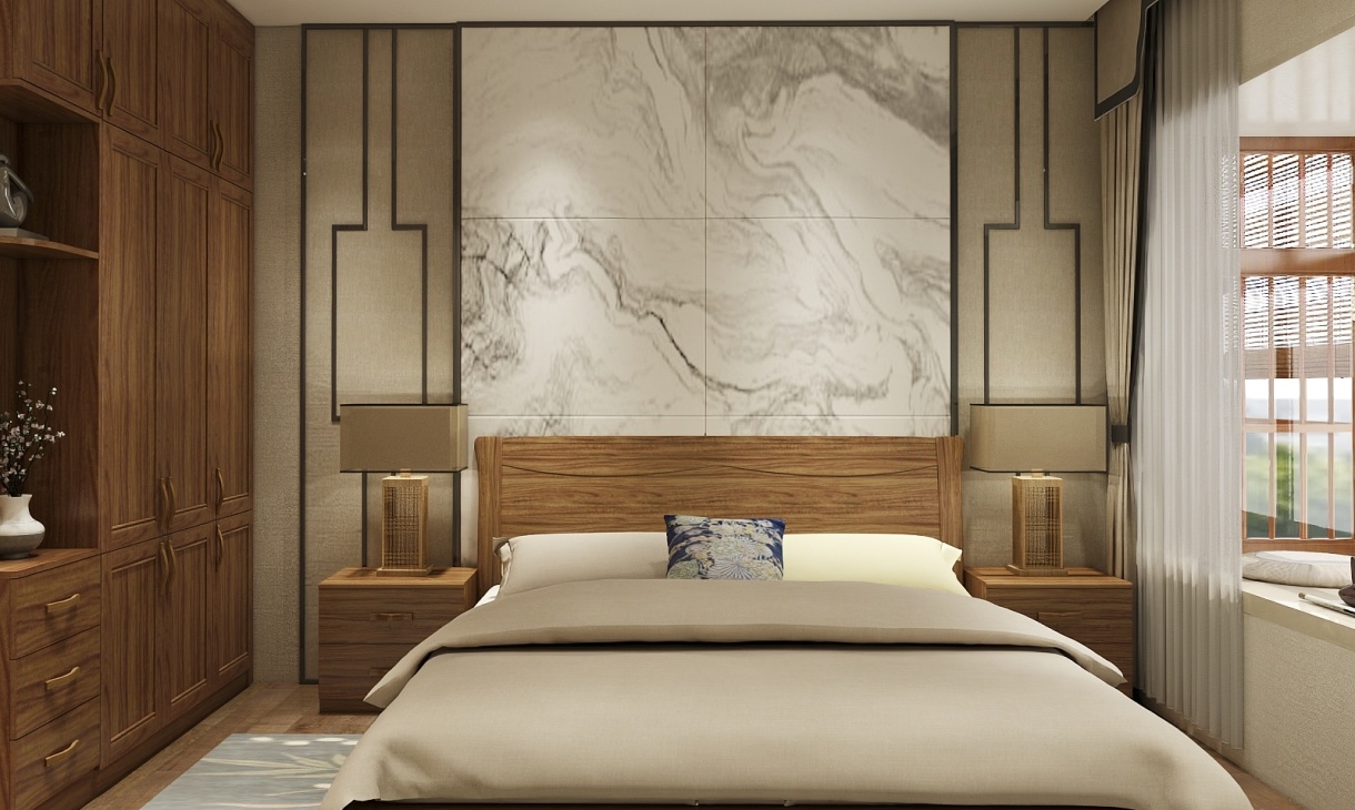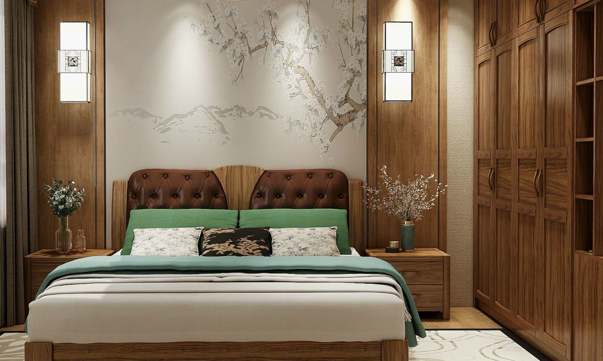木質背景墻加富有中國風的畫將中式風襯托的淋漓盡致,衣柜都采用拼框式門板,樣式復古有韻味。