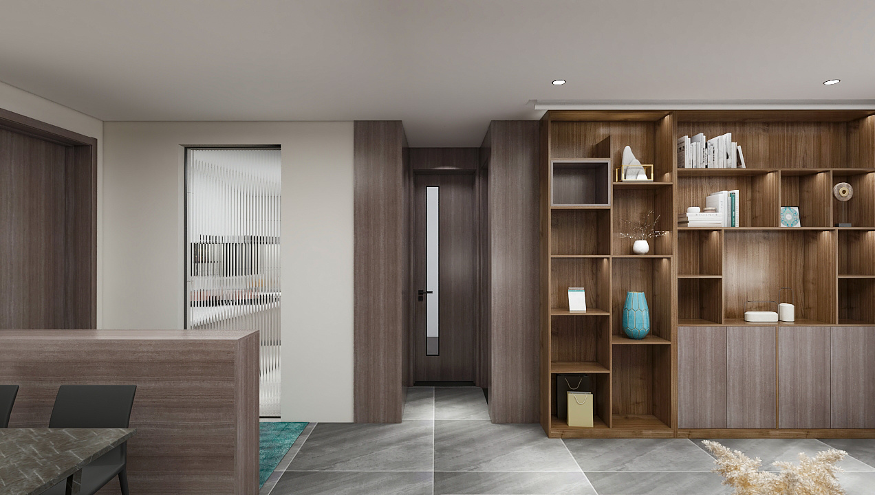 入戶玄關采用半高鞋柜,空間既不顯壓抑也能滿足日常收納需求。鞋柜底部鏤空,嵌入隱形燈帶,便于日常更鞋換鞋。