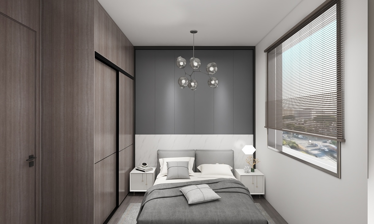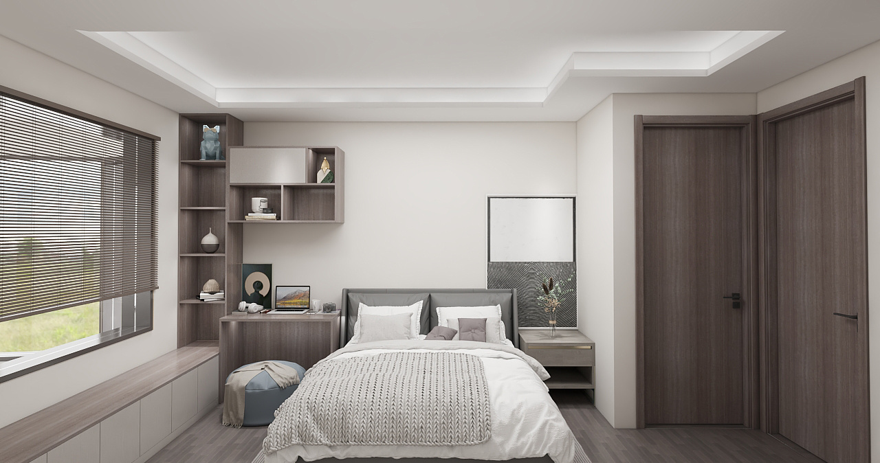 次臥區別于主臥采用深色胡桃木,整墻的衣柜簡潔大方不過時,雖然臥室較小但不顯空間壓抑。灰白拼接設計,充滿時尚感,不易過時。