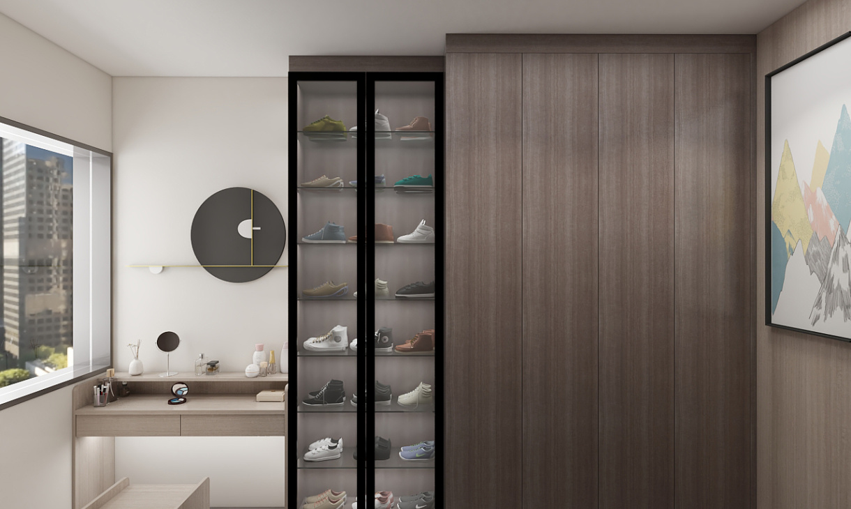 臥室內隱藏的衣帽間,打開門就是另一個小天地。一門到頂的無拉手設計,大氣美觀。一門到頂玻璃門,內嵌隱藏式燈帶存放包包,或者鞋子、手辦都是一道靚麗的風景線,既可儲物又具有展示功能。