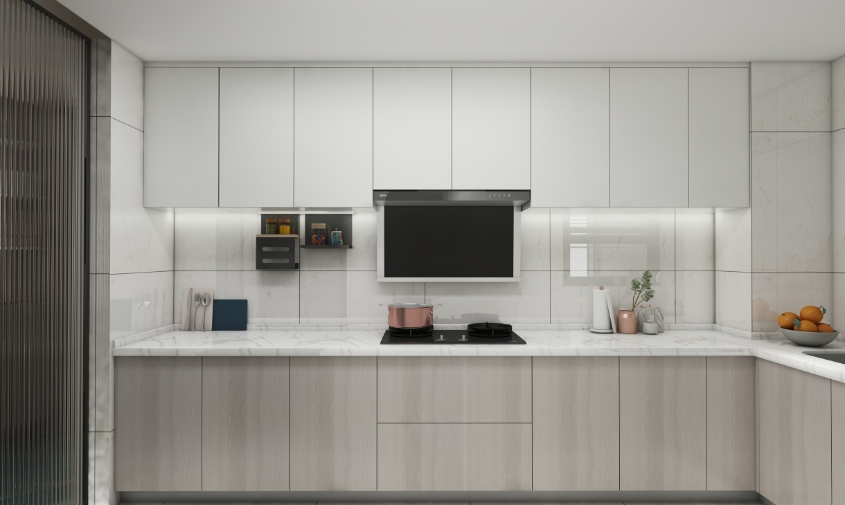 廚房以干凈清爽的配色為主,搭配淺色胡桃木,簡潔大氣的設計理念除了在色彩上,外觀也采用無拉手設計,清新舒適的視覺享受。