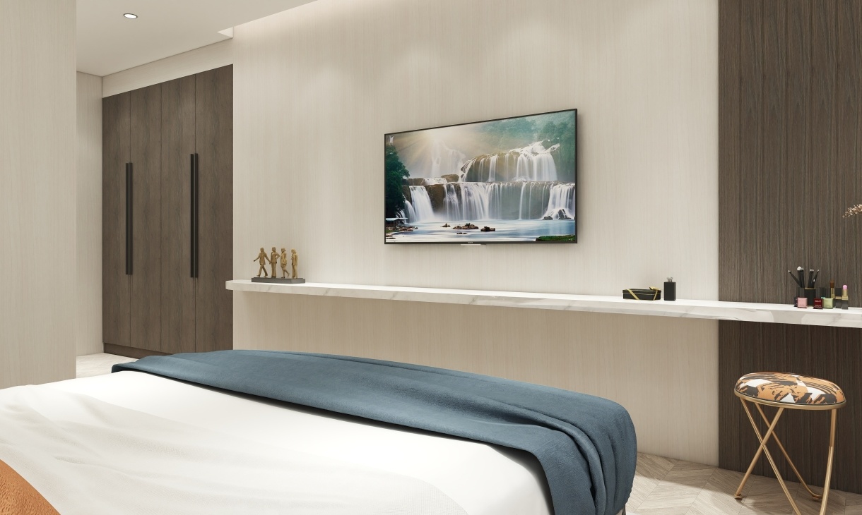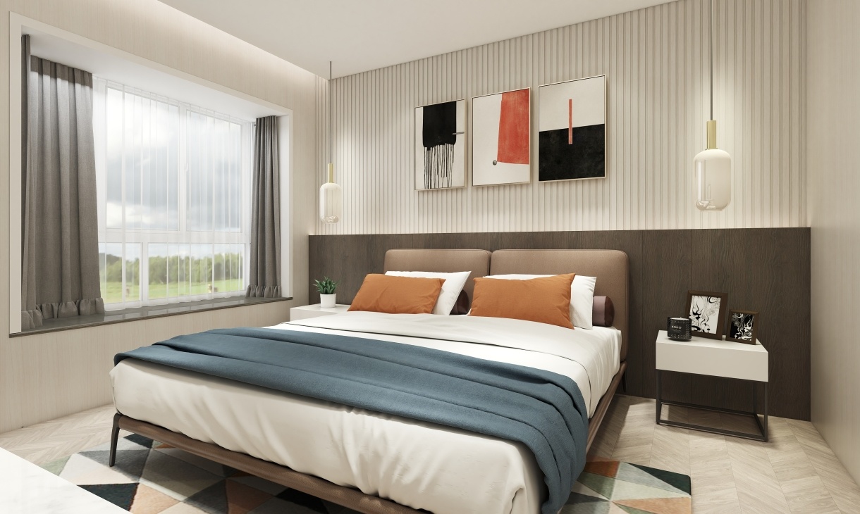 大理石臺面與兩種色調(diào)木飾面搭配整體和諧簡約,床頭吊頂的虛光設(shè)計簡約時尚,營造溫馨、自然的居住環(huán)境。