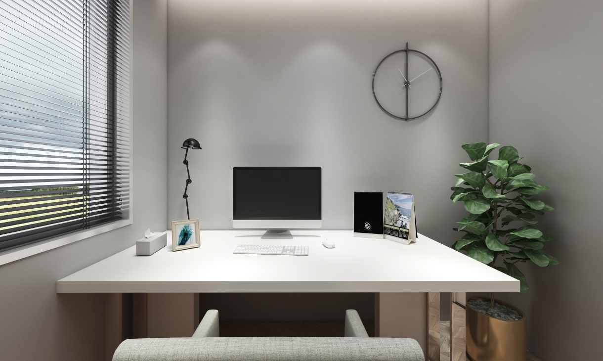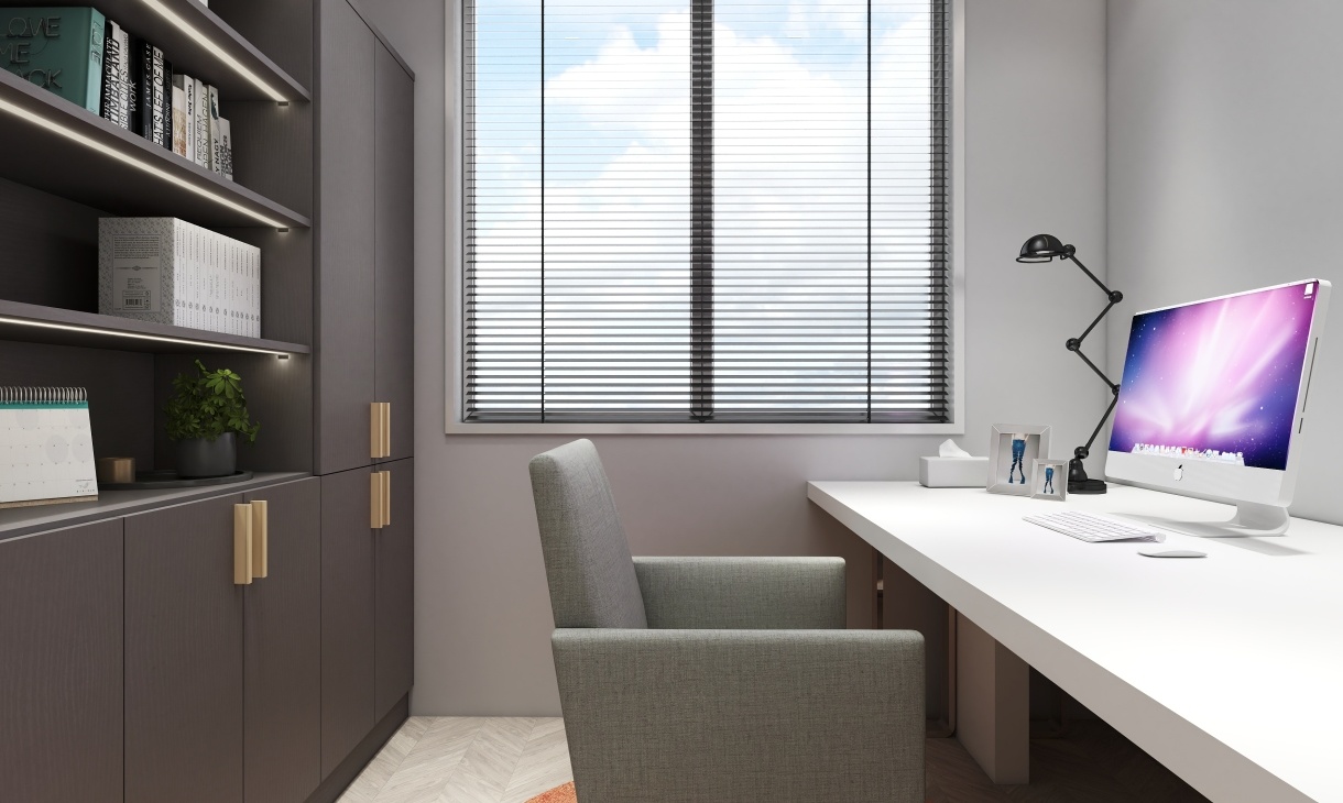 一個獨立的空間會提高辦公效率,簡約小清新風(fēng)格的淡灰色墻體,營造一個輕松愉悅辦公氛圍的空。鐵灰色書柜簡約實用,金色拉手點綴空間。