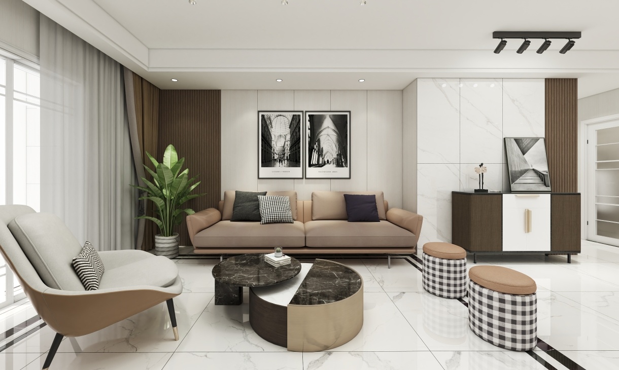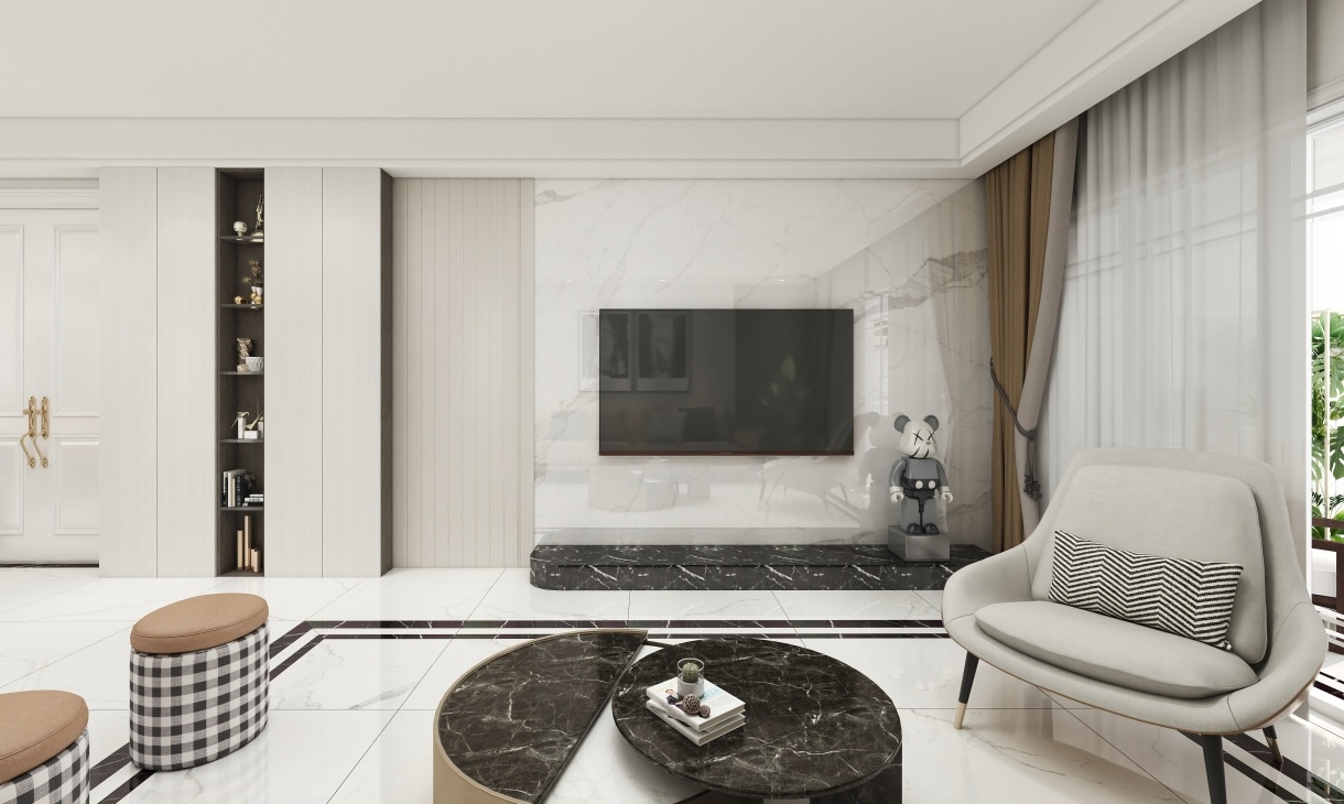 客廳最為突出的就是黑白兩色的經(jīng)典大理石花紋磚,黑白對比層次分明,作為經(jīng)典建筑材料流傳至今,再搭配現(xiàn)代風(fēng)格木飾面格柵,給人以自然純凈之美。