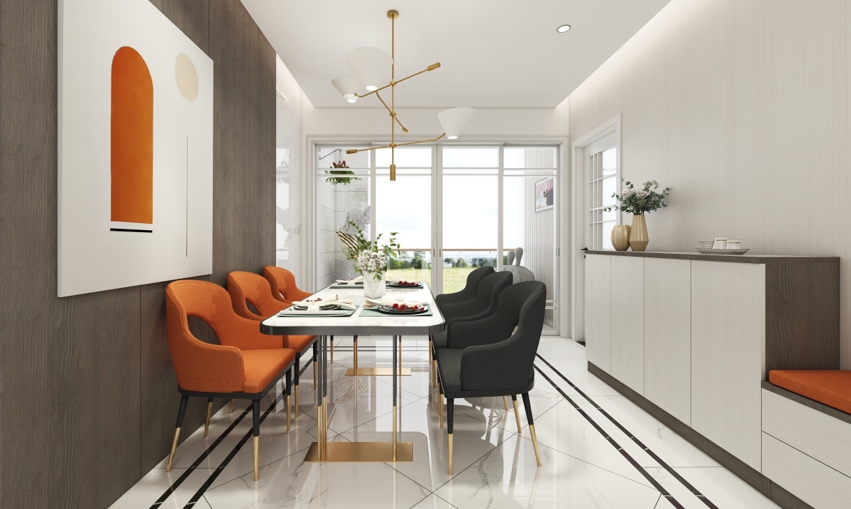 橙紅色與黑色的搭配,木飾面與大理石瓷磚的搭配讓空間整體性更強,大理石餐桌和大理石瓷磚背景墻相呼應(yīng),黑色桌椅與深色木飾面的搭配也讓整個空間的色彩做到了和諧統(tǒng)一。