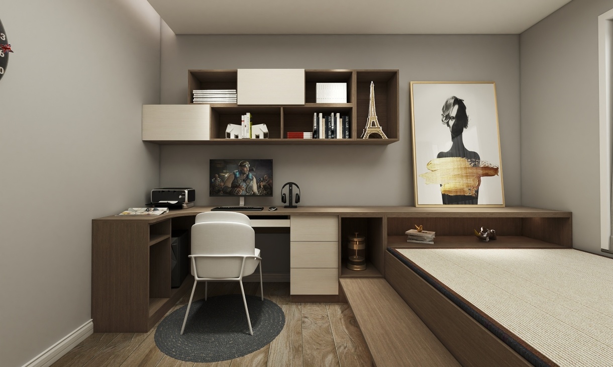 客臥定制榻榻米床,榻榻米與轉(zhuǎn)角書桌整體搭配,統(tǒng)一協(xié)調(diào),讓辦公空間與休息空間兩者完美結(jié)合,打造超強收納與美觀實用的融合。