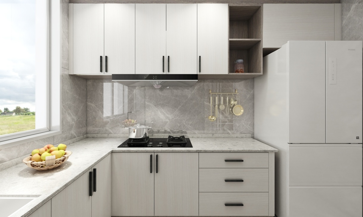 廚房以灰白淺色為主調(diào),營造視覺上的輕快舒適,灰色瓷磚兼顧美觀性和實用性,地磚上墻減少瓷磚接縫讓廚房墻面更加簡潔易打理。