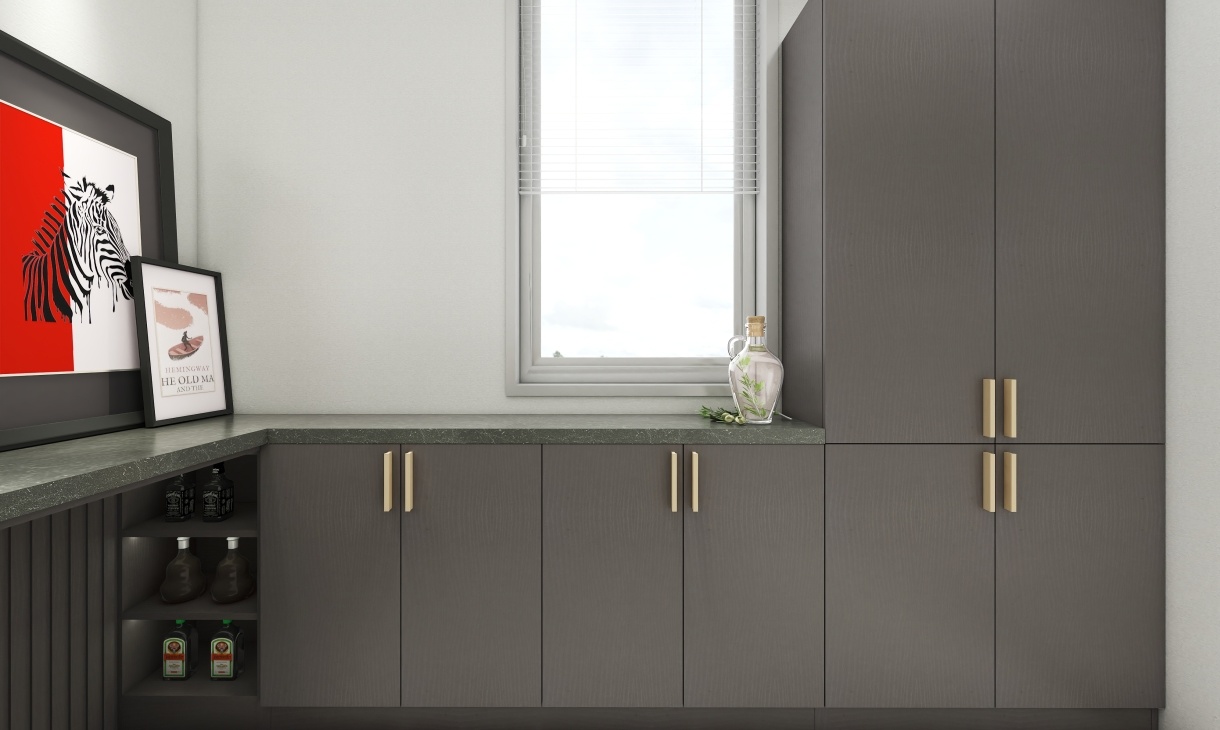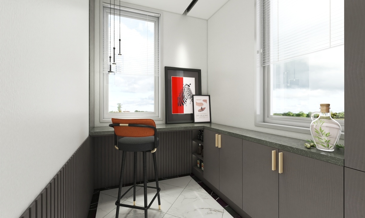 利用這個狹長的空間定制一套收納柜,深灰色臺面延申窗邊打造吧臺,為主人提供一個安靜的下午茶空間。