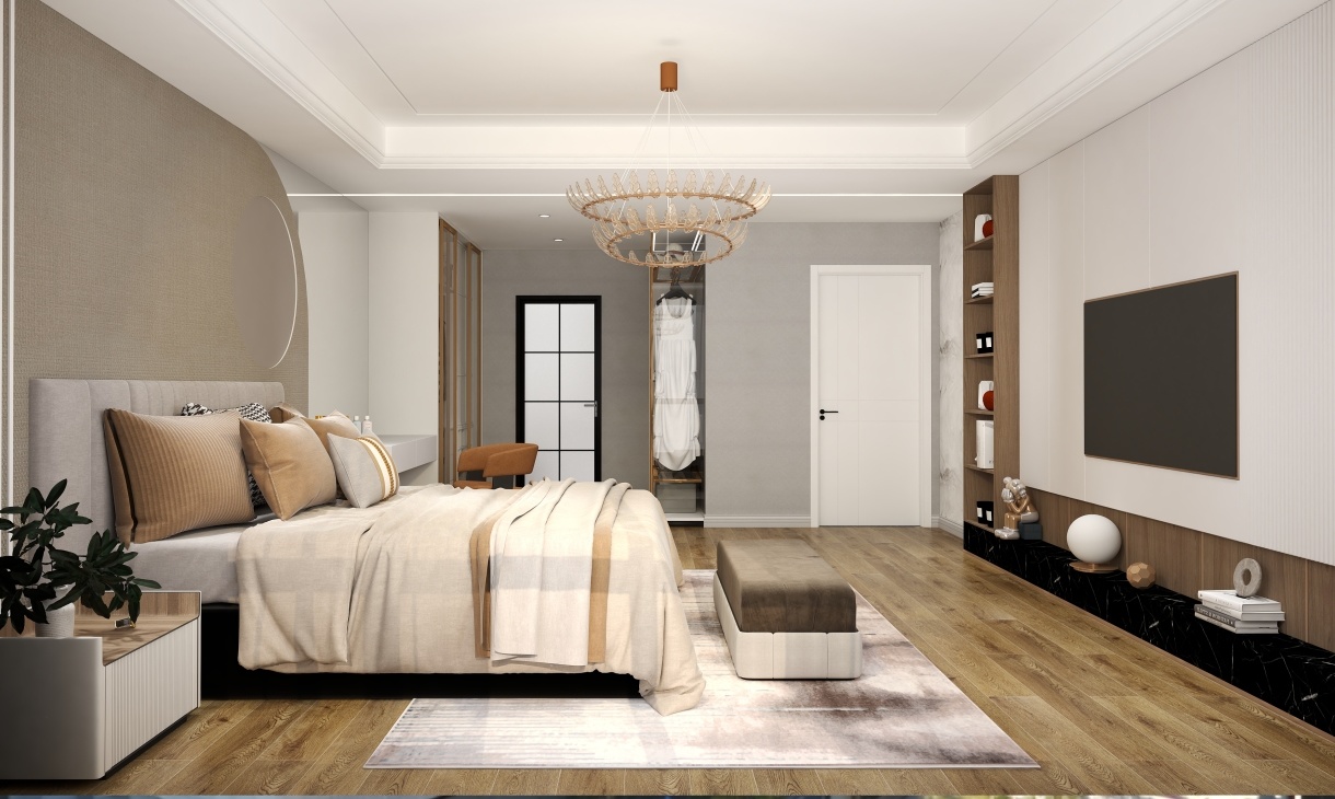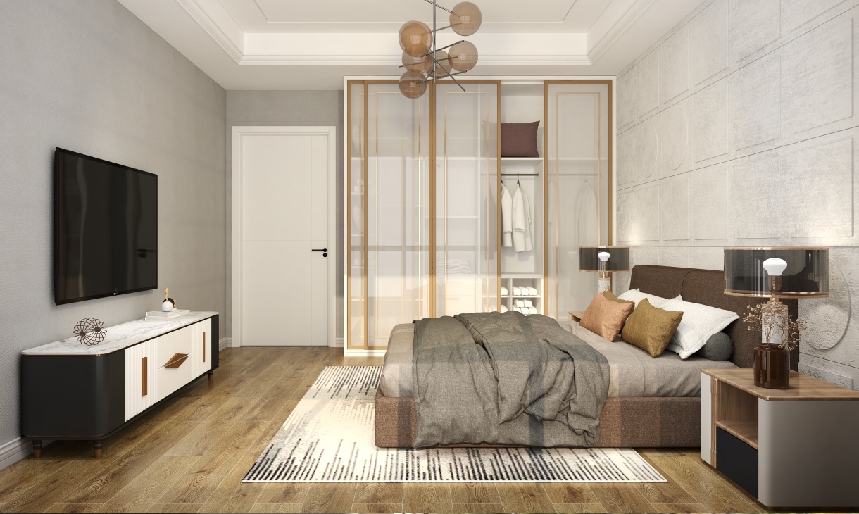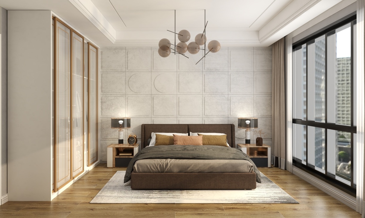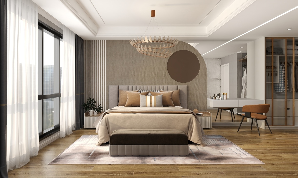 主臥以幾何圖案為設計點,搭配顏色不同的條紋來展現空間層次感,落地大窗搭配木地板使得空間溫馨不失品味,盡顯舒適。