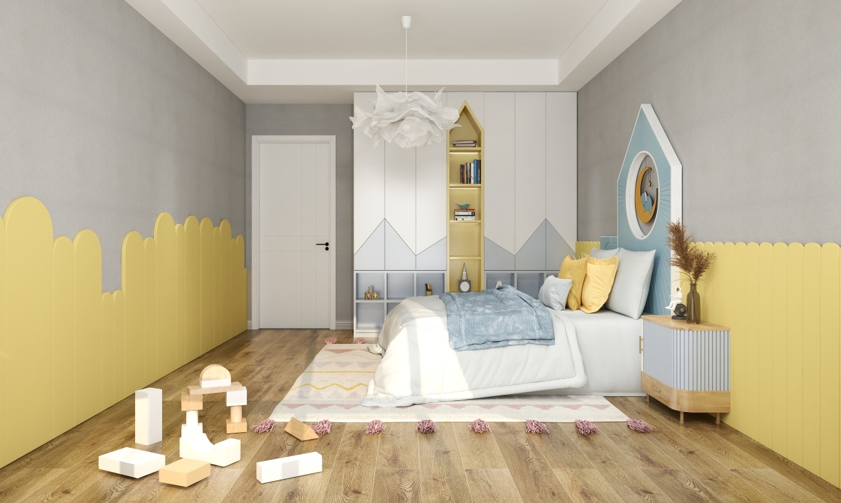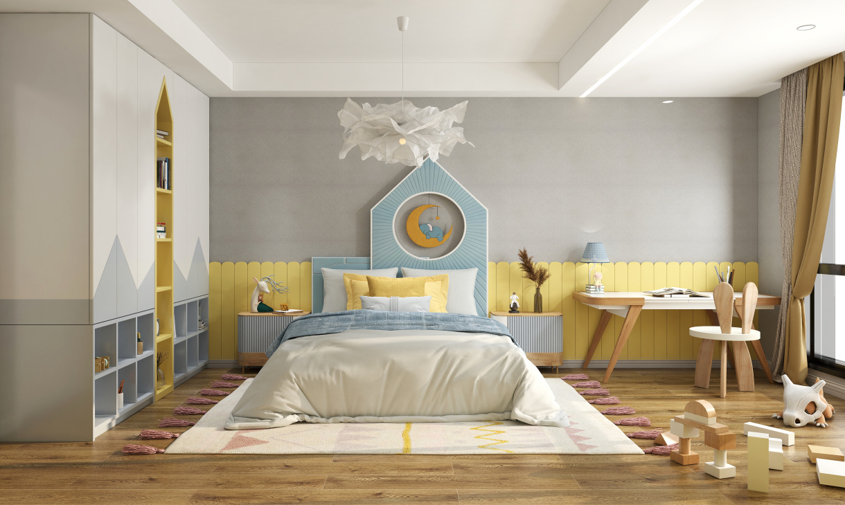 兒童房設計以簡為主,選用藍色與黃色交織,營造出一個充滿活力的兒童房空間,守護孩子的成長。