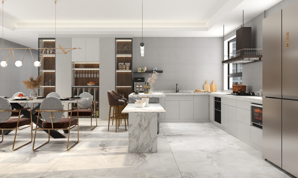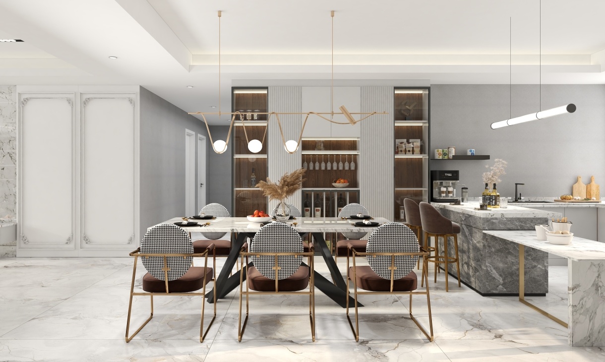 餐廳與廚房設計于一體,大理石臺面實用又帶點微奢感,整體設計簡約而不單調,在這里用餐都是一種享受。
