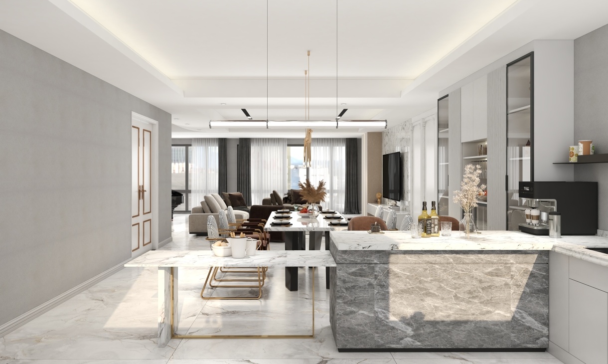 開放式的廚房搭配大理石臺面,簡單之中不失品位,櫥柜的設計以流暢的線條搭配高質感的板材,營造出高格調的舒適空間。