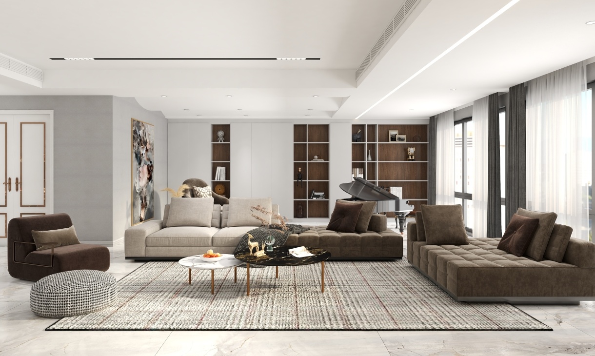 客廳整體呈現出簡潔的視覺效果,沙發用淺灰色、深棕色搭配格外有品位,沙發背后空間不浪費設計成休閑實用區,提升空間格調。