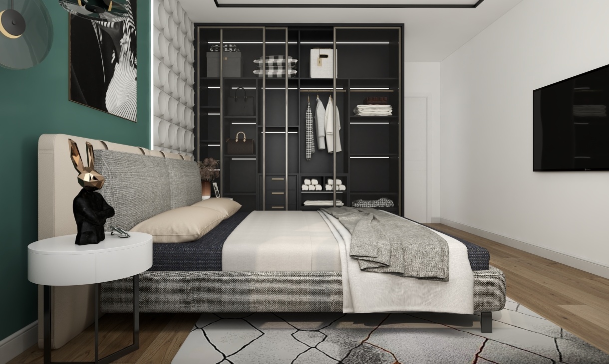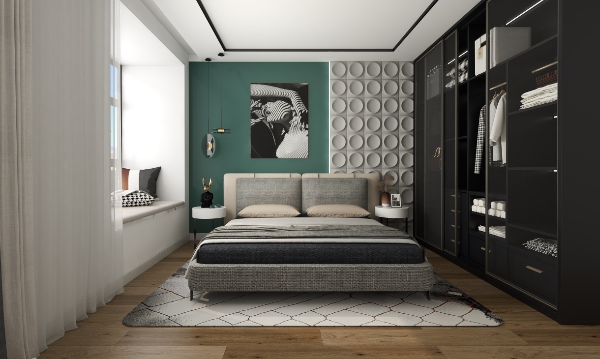 臥室需要溫馨舒適的氛圍沒,設計懸掛吊燈作為光源,燈帶隱藏于大面積吊頂中更加美觀,黑色的開放式衣柜質感十足。