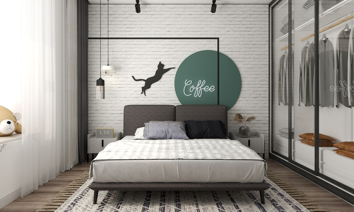 兒童房設計簡單,用綠色裝飾畫和貼紙裝飾墻面,整體布局以簡潔大氣為主,營造出一個愉悅、充滿童趣的空間。