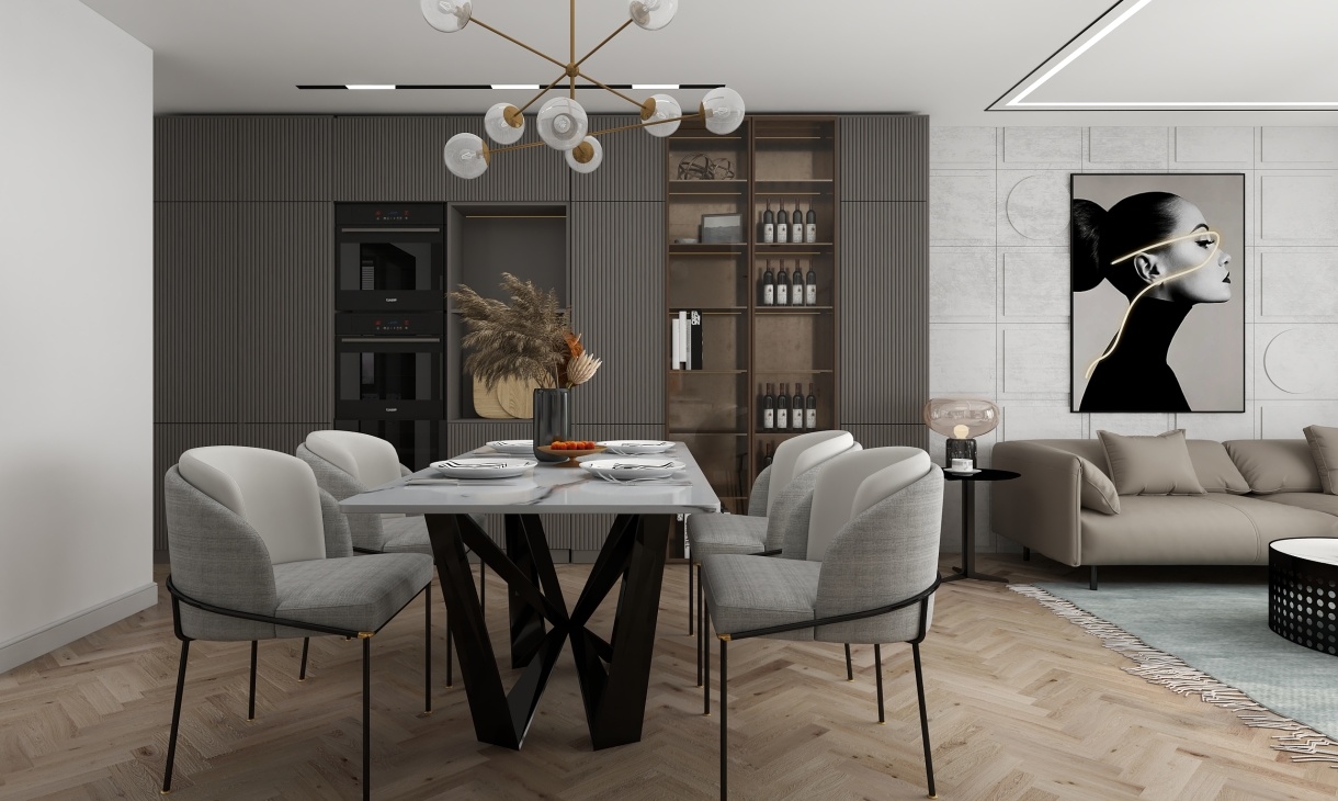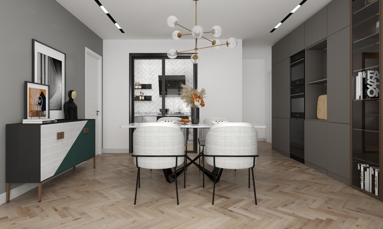 黑白餐桌椅結合燈光給與人視覺上空間的延伸,簡單又大氣,餐邊柜設計開放格拿取更方便,大理石餐桌臺面,更有格調。