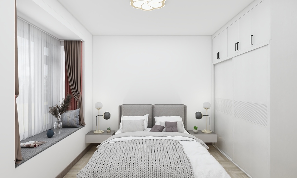 次臥的色調白灰為主,沉穩大氣非常適合老人居住,飄窗設計成休閑區,既豐富了空間又盡顯獨特的生活品味。