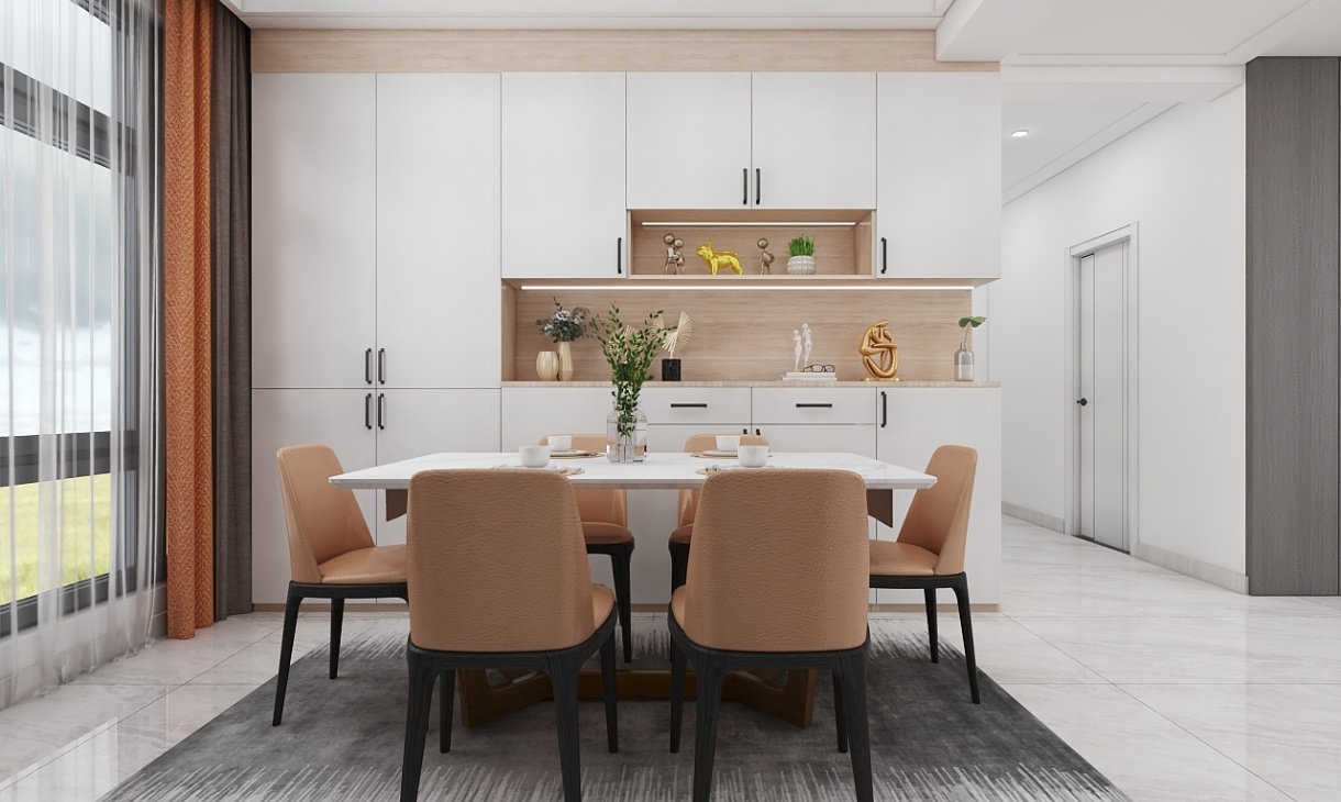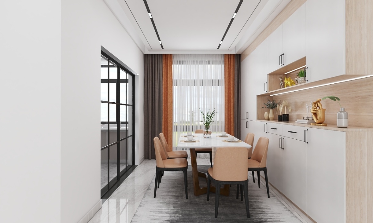 餐廳設計依舊簡約,白色與橙色為主,窗簾的顏色與餐椅相呼應,卻給人一種溫馨舒適之感,餐邊柜隱形燈帶的設計非常人性化。