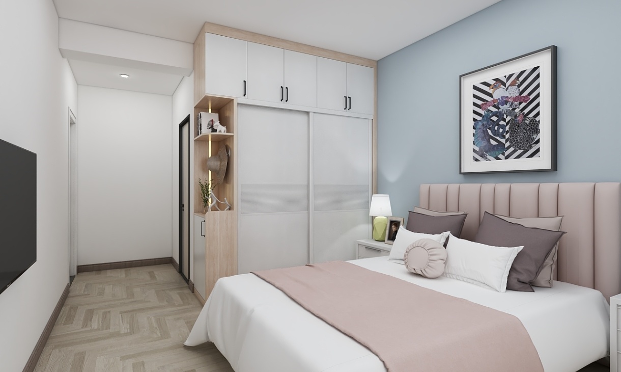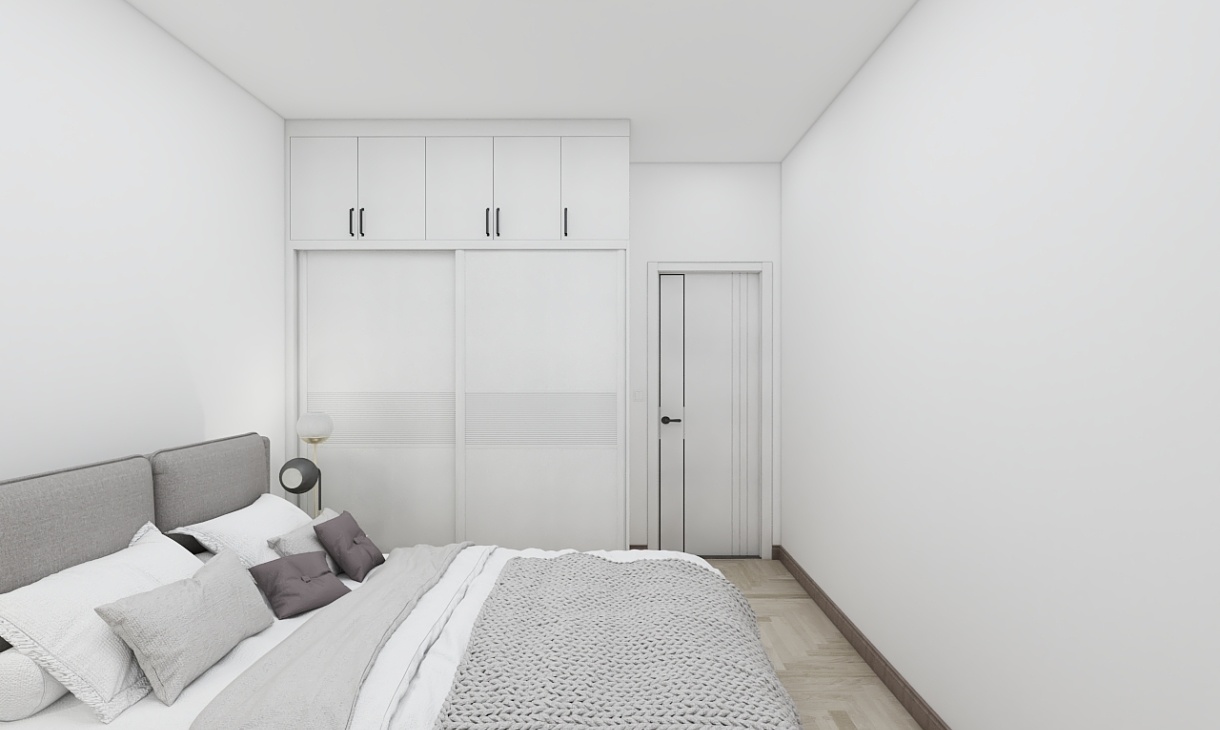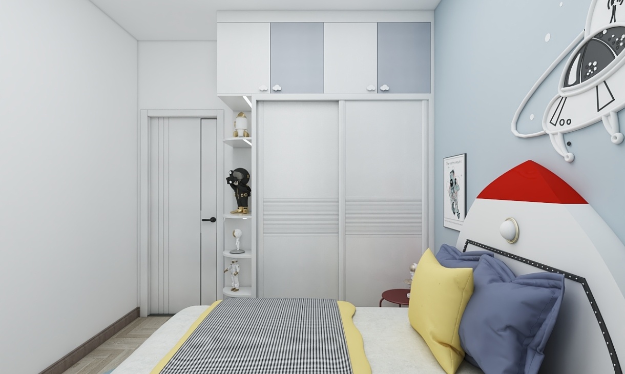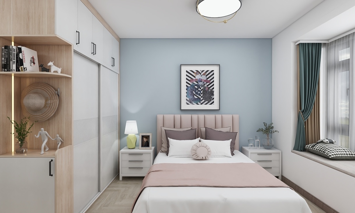 臥室的電視背景墻沒做任何裝飾,搭配客廳軟包大床和藍色背景墻豐富又美觀,到頂衣柜選擇推拉門的設計,節省空間又很實用。