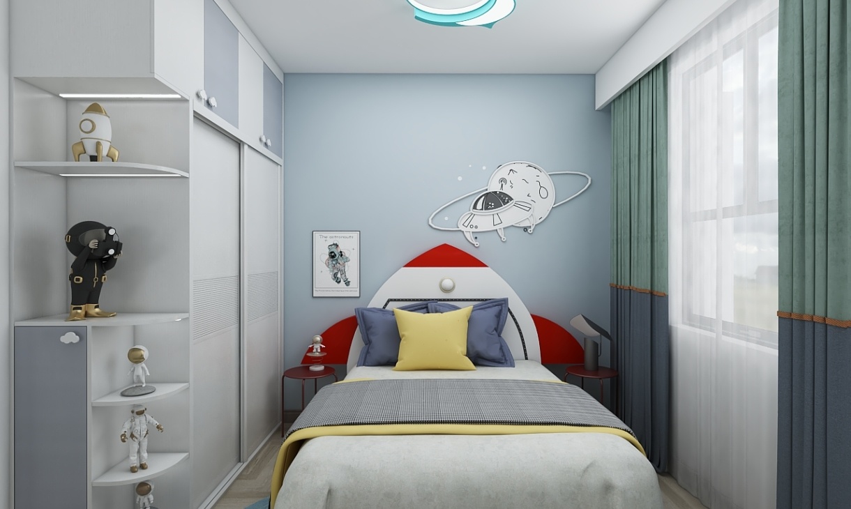 男孩房主要以白色+藍色為主色,背景墻上的裝飾畫和亮黃色的軟飾點綴,讓單調的兒童房顯得十分有趣。