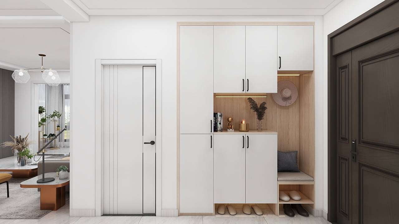 入戶的鞋柜設計成“頂天式”,集收納展示于一體,底部收納鞋子方便又實用,墻面空間也不浪費,設計懸掛區,輕松收納帽子、外套燈物件。