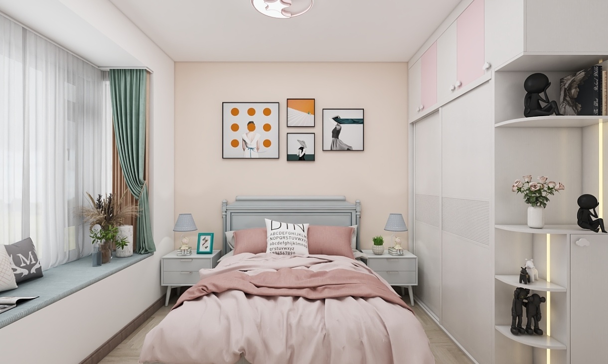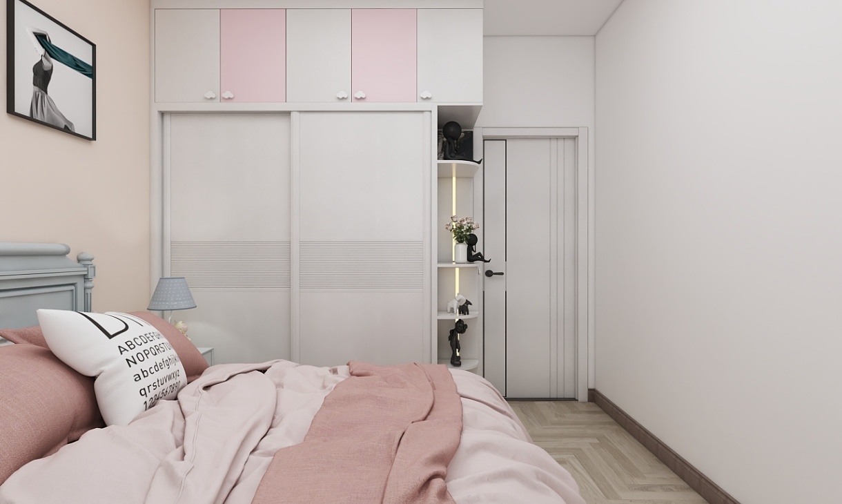 女孩房設計選擇使用暖色調,裝飾以粉色系為主,顯得非常干凈浪漫,飄窗和到頂衣柜非常實用,推拉門的設計也非常人性化。