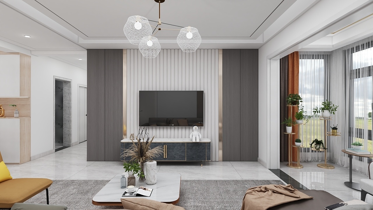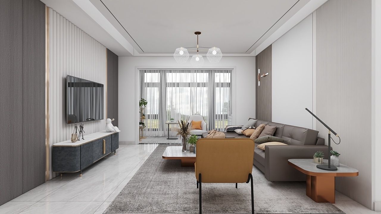 客廳灰色系的電視柜和沙發搭配棕色的茶幾,給人一種品位非凡的感覺,棕色和綠植的點綴顯得格外溫馨,灰色地毯提升空間質感。