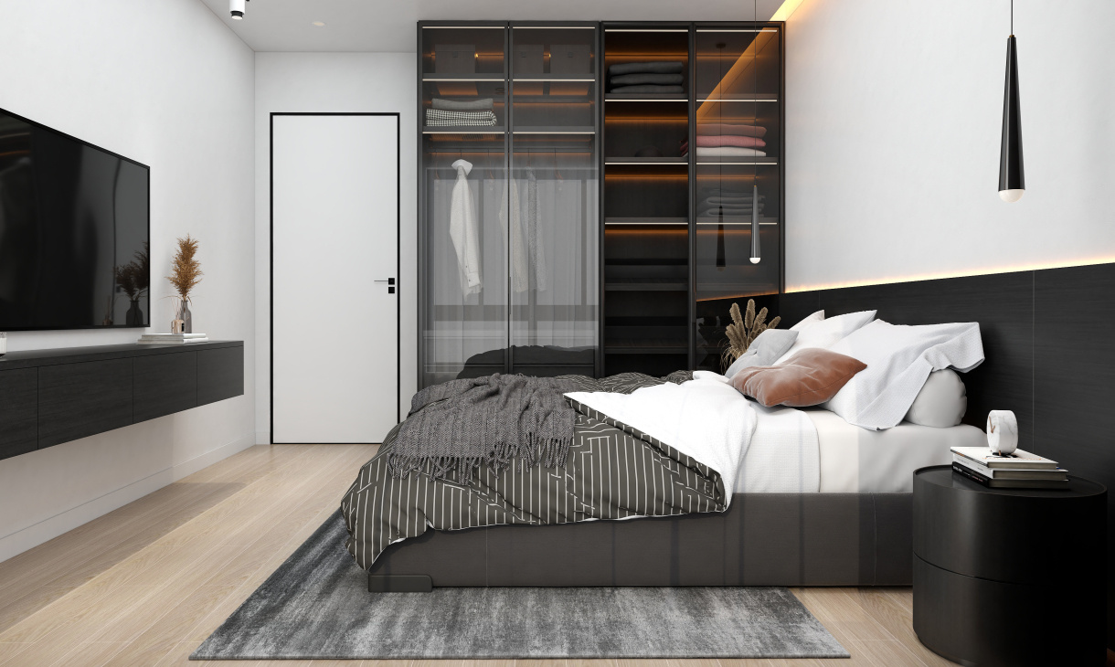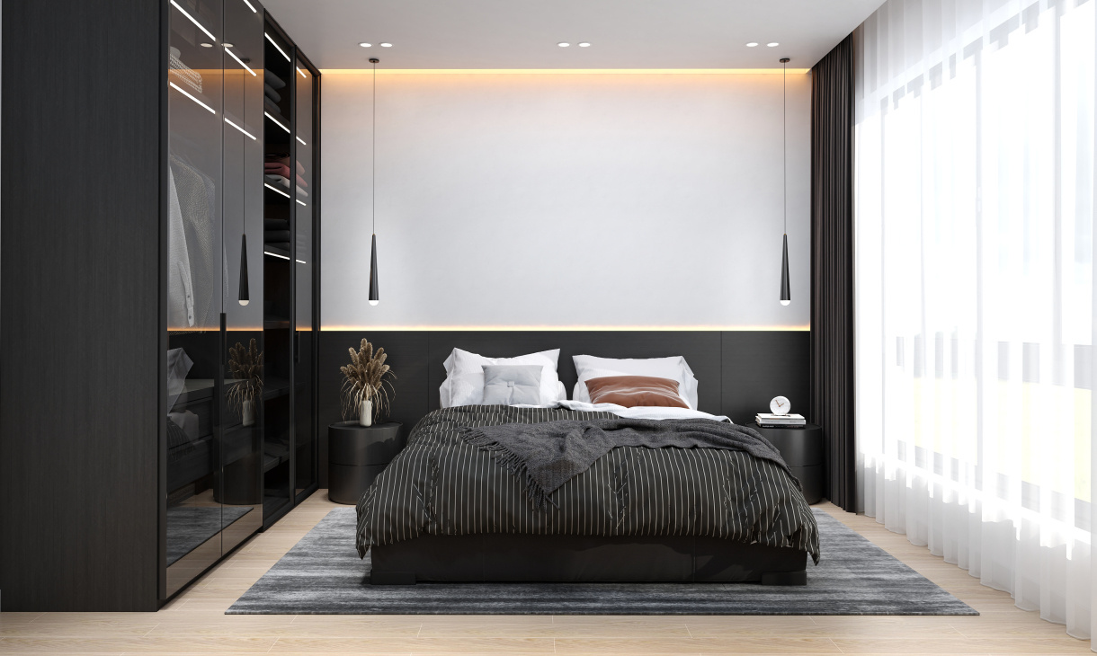 臥室雙人床背后的背景墻設(shè)計簡單時尚,拼接色既相互呼應(yīng)又品位十足,深灰色的到頂衣柜采用玻璃柜門,搭配感應(yīng)燈管美觀又實(shí)用。