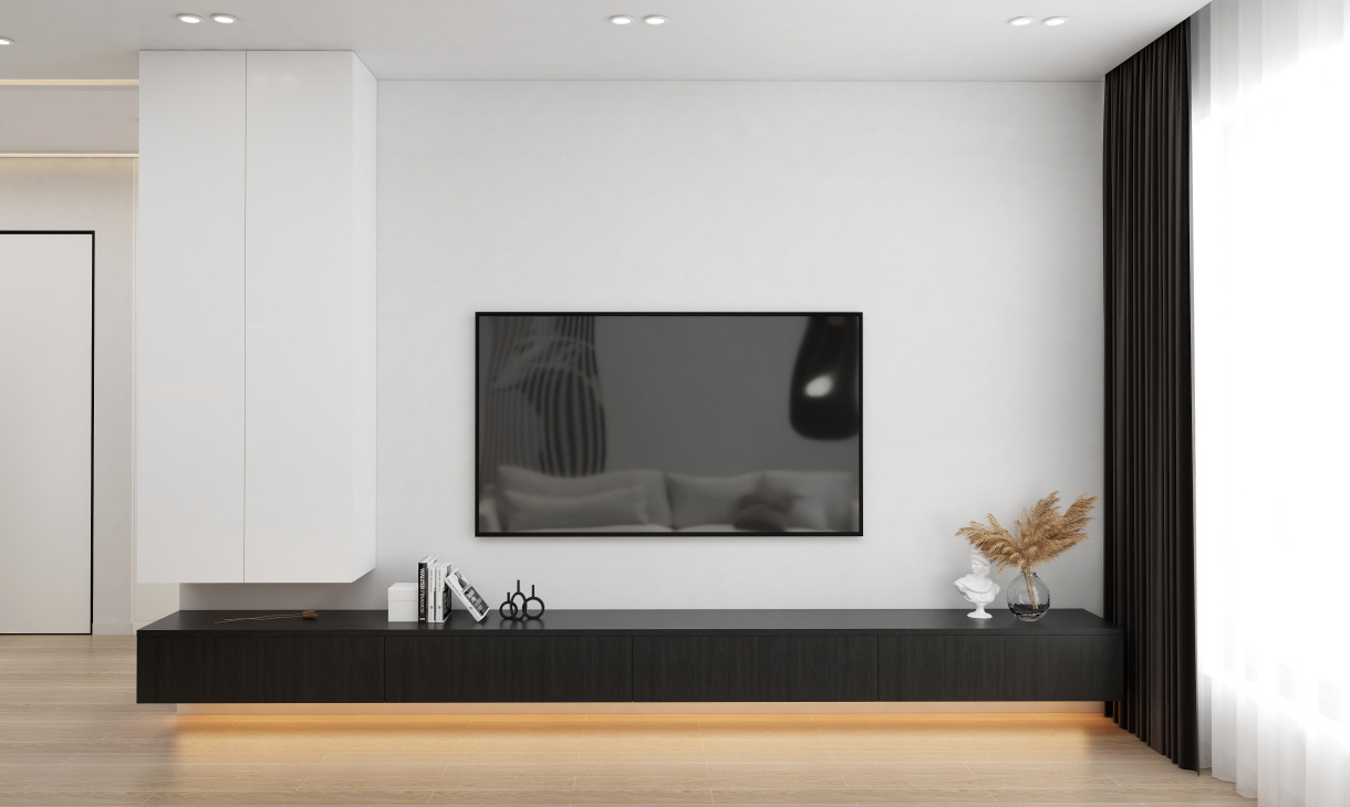 深灰色電視柜與白墻連為一體,對比明確不顯突兀,懸空設(shè)計最大程度上節(jié)約了空間,電視柜上的裝飾,簡約精致。