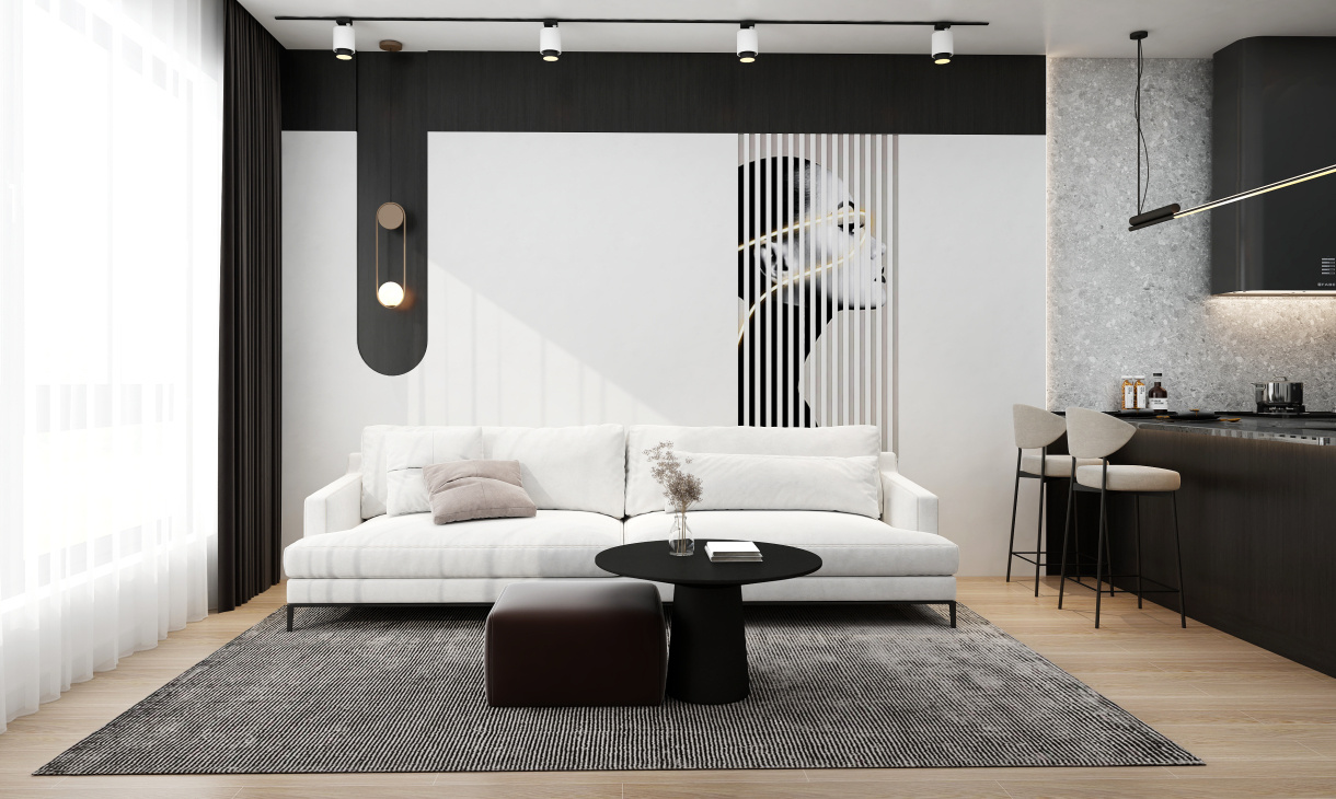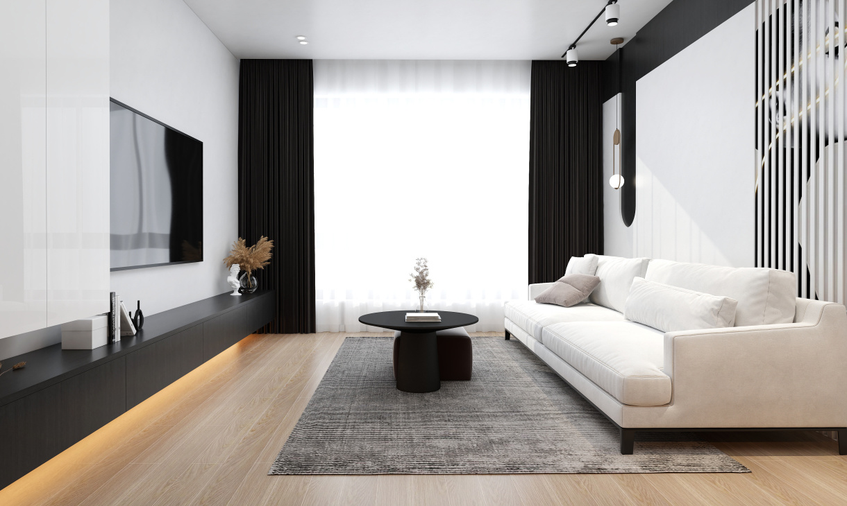 客廳由木地板和白色背景墻為主,暖色燈光搭配白色沙發(fā)和黑色茶幾,顏色豐富不花哨,使得客廳看起來明亮又溫馨。