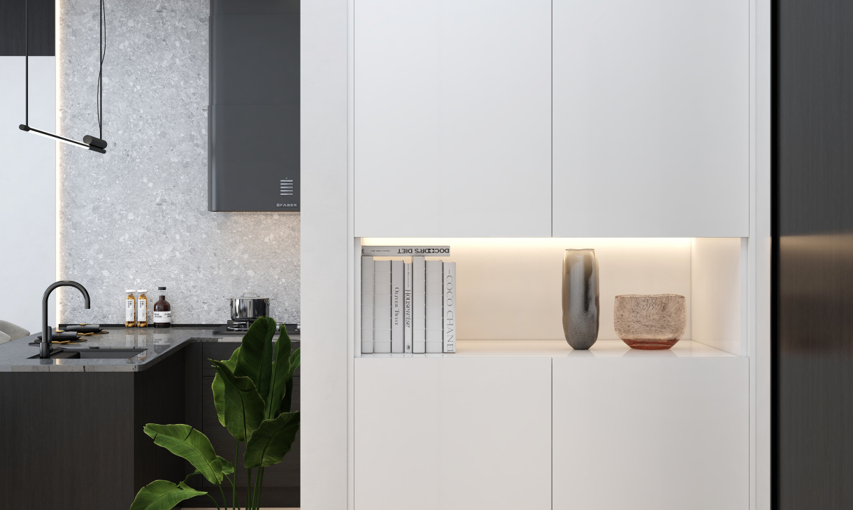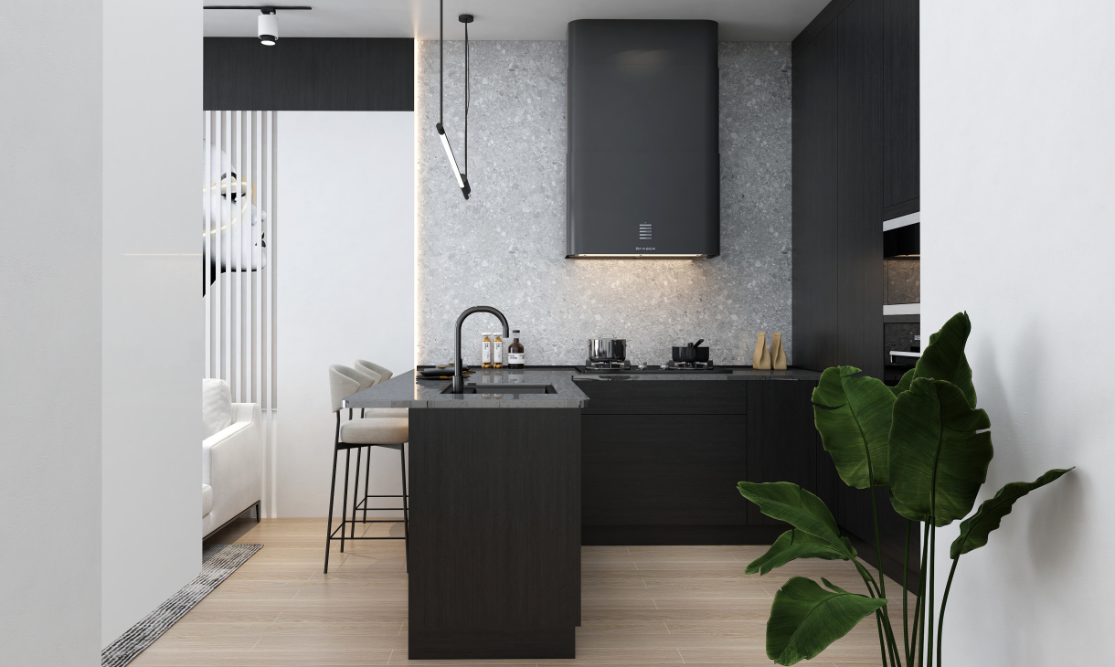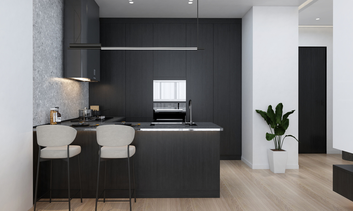 開放式廚房設(shè)計整面櫥柜,收納省心又品位十足,深灰色的櫥柜格外有質(zhì)感搭配雪花灰背景墻,顏色沉穩(wěn)又時尚,一整排的吊柜保證了日常儲物需求。
